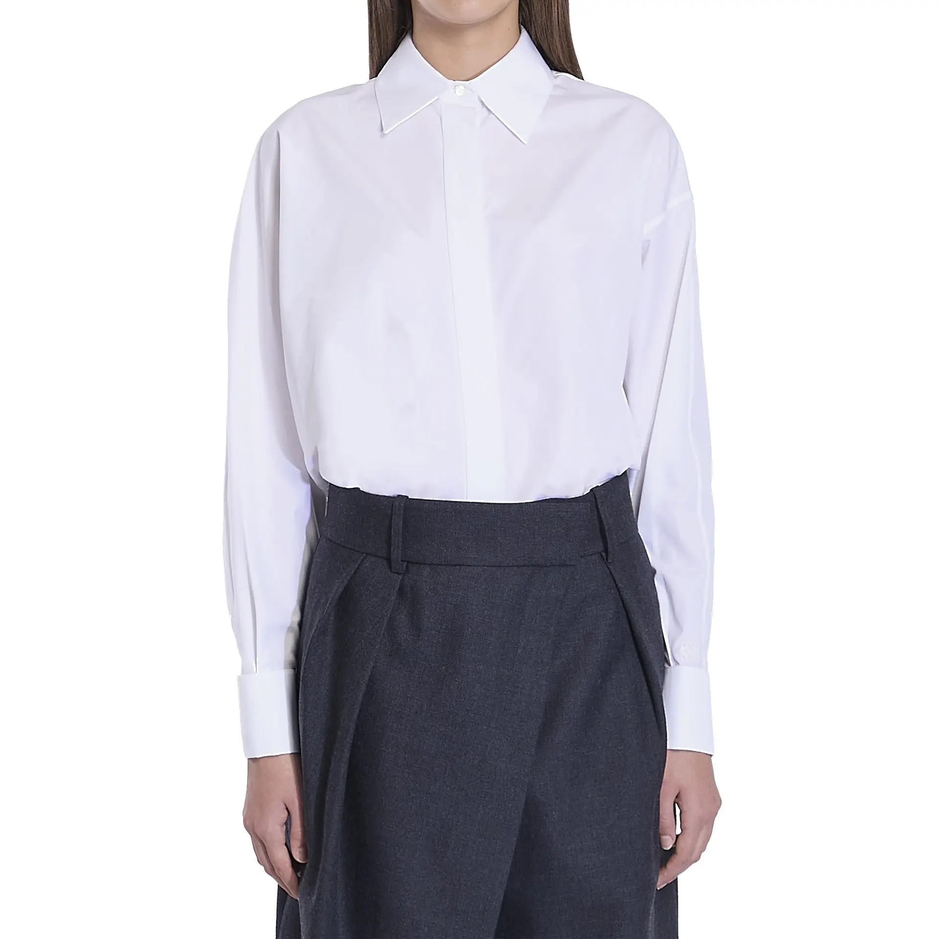 - Composition: 100% Cotton - Classic collar - Asymmetric design - Buttoned cuffs - Batwing sleeve on one side - Front concealed button closure - Anagram embroidery on left sleeve - Made in Italy - Gender: WOMEN - MPN S540Y05XA1_2100 - Barcode: 0011174042 - Code: TOP LW 2 SH SS25 13030