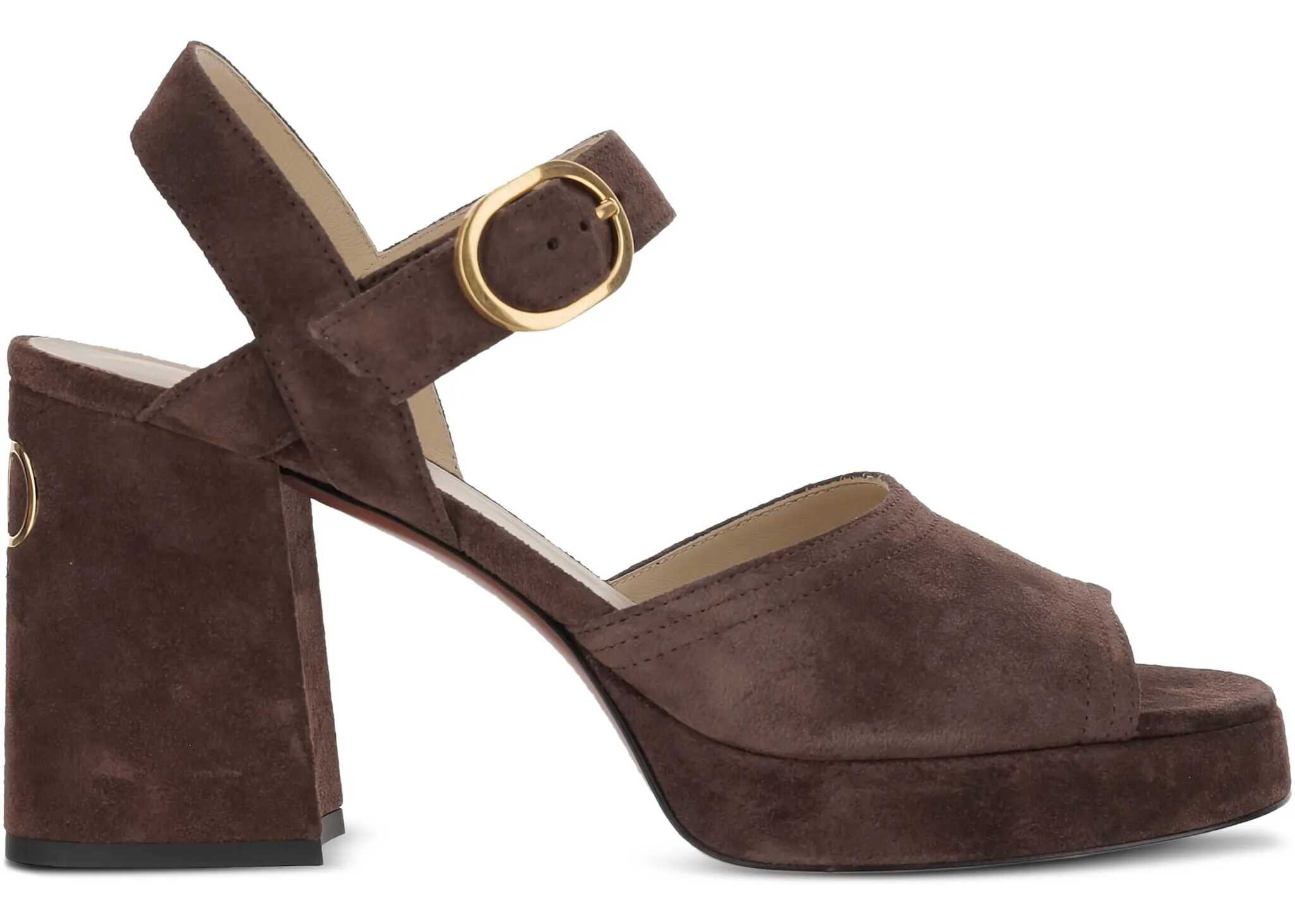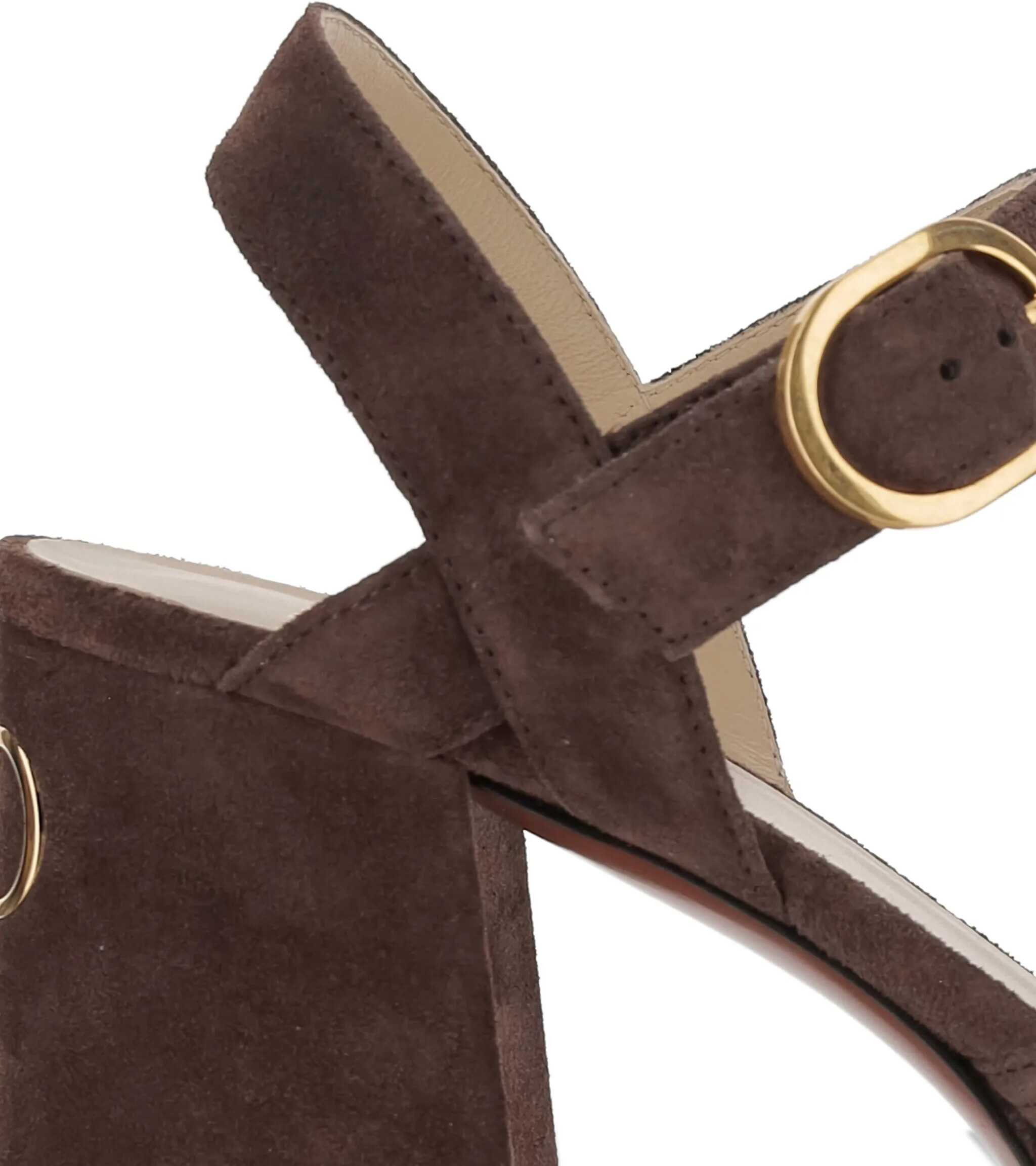 Brown suede Valentino Garavani sandals. Feature an open toe, an adjustable strap, a platform, a block heel, and a VLogo Signature finish on the heel. A dust bag is included.