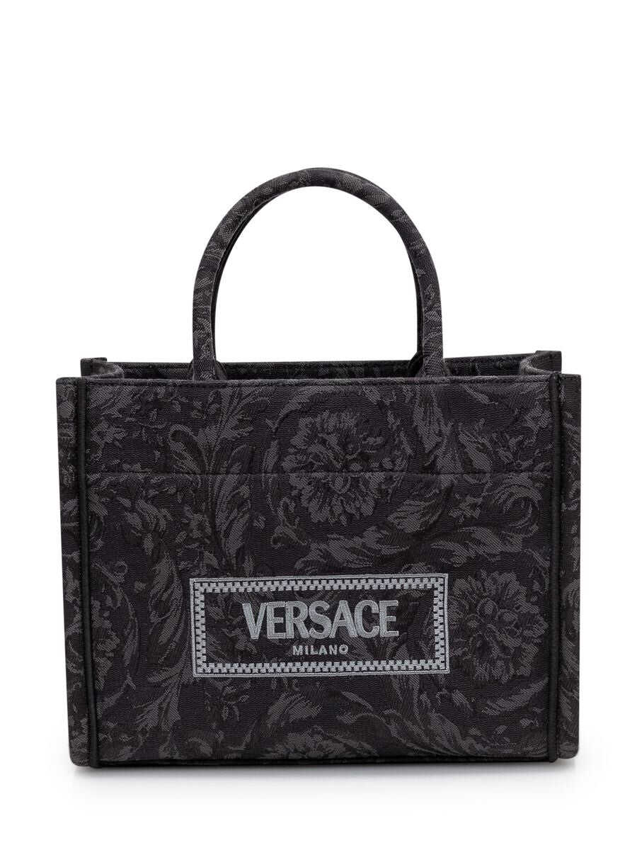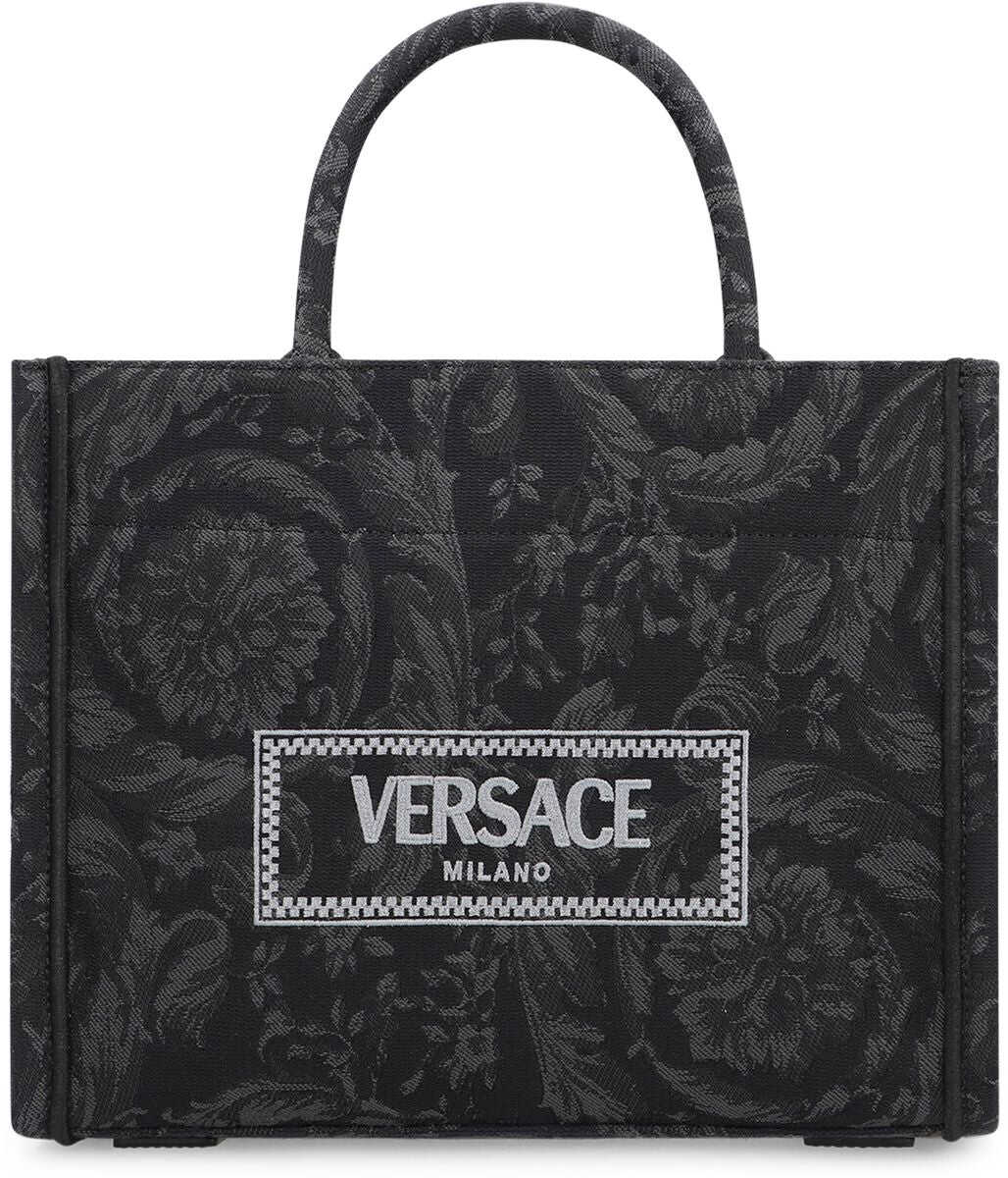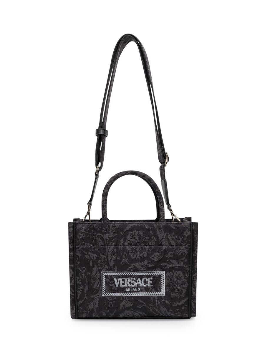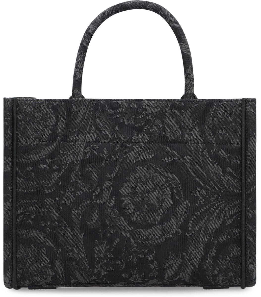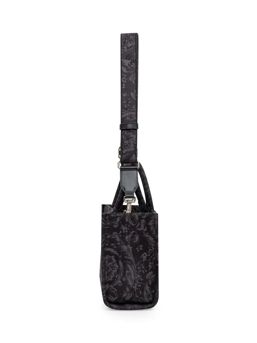 Black tote bag. Two handles. Adjustable shoulder strap. '90s Vintage logo embroidery. Baroque motif. Inside zipper pocket.