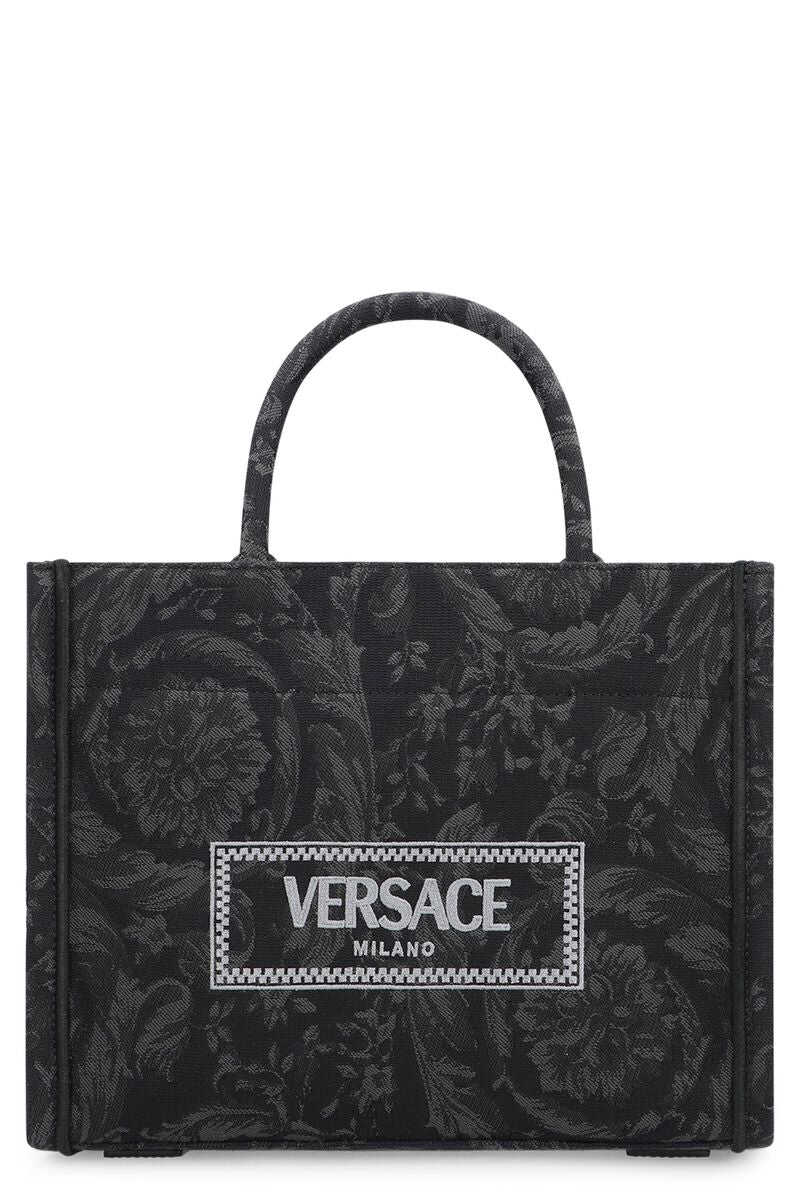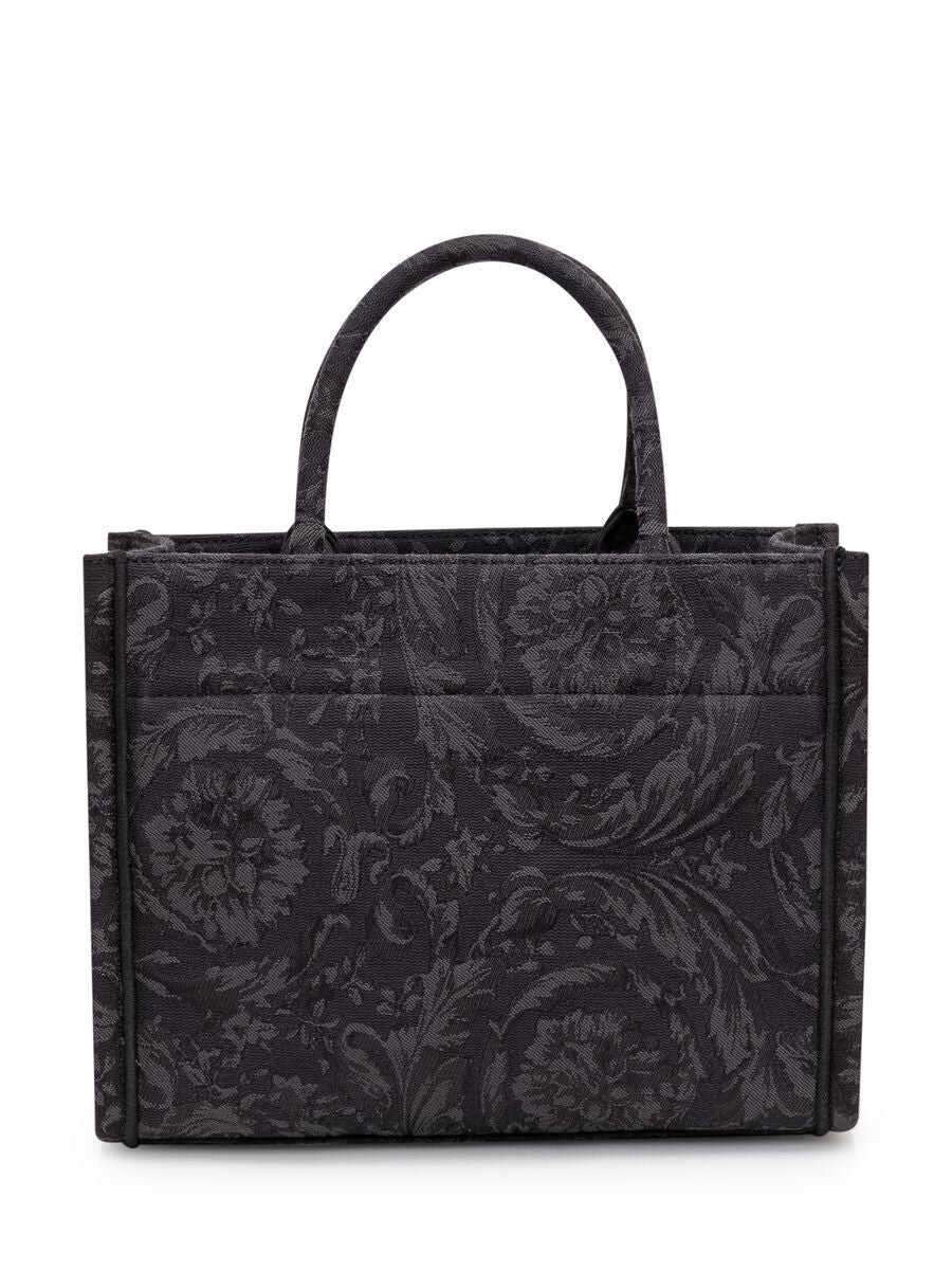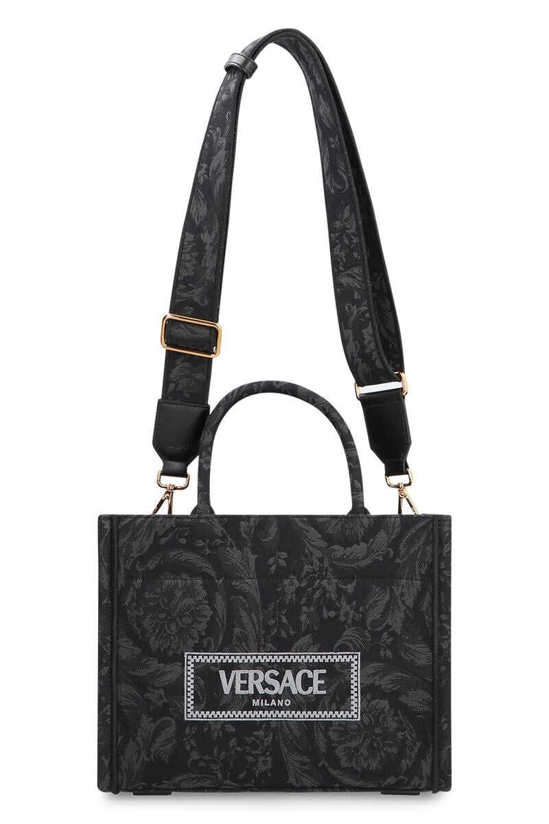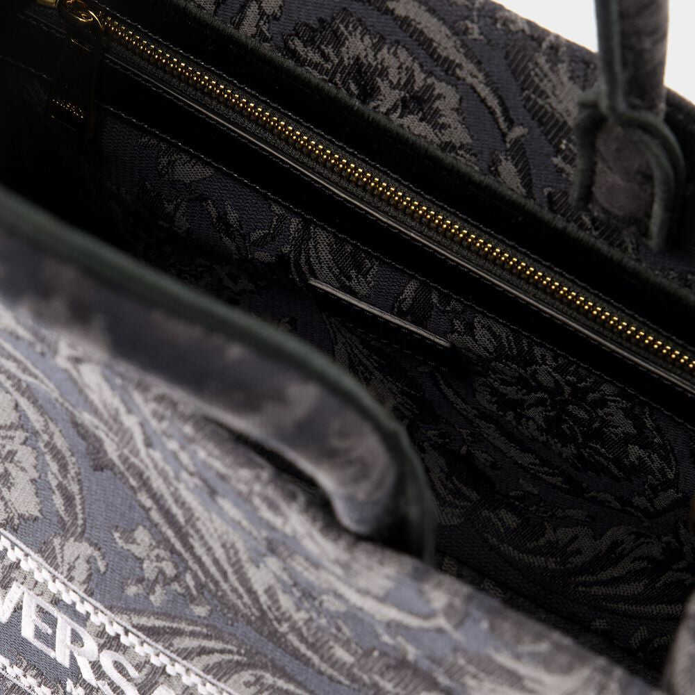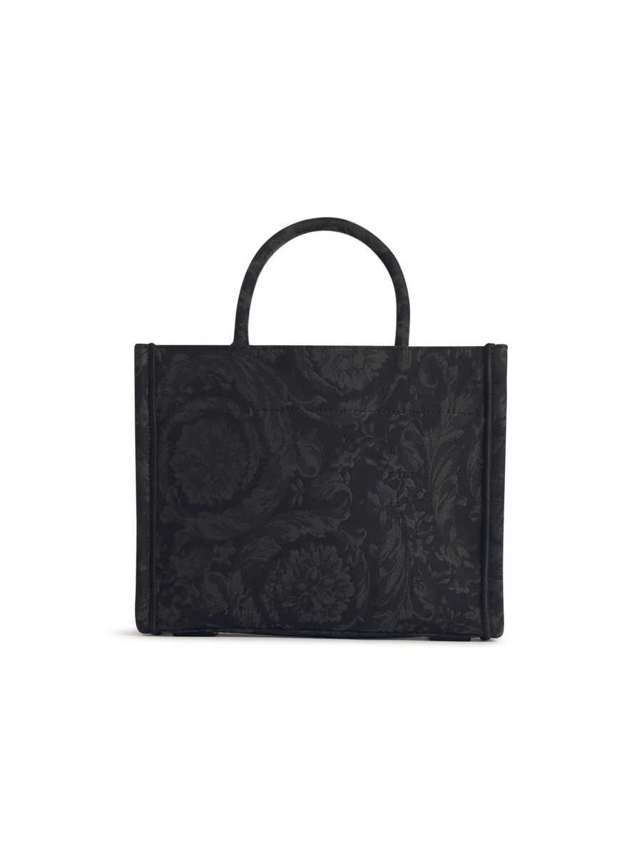 Black tote bag. Two handles. Adjustable shoulder strap. '90s Vintage logo embroidery. Baroque motif. Inside zipper pocket.