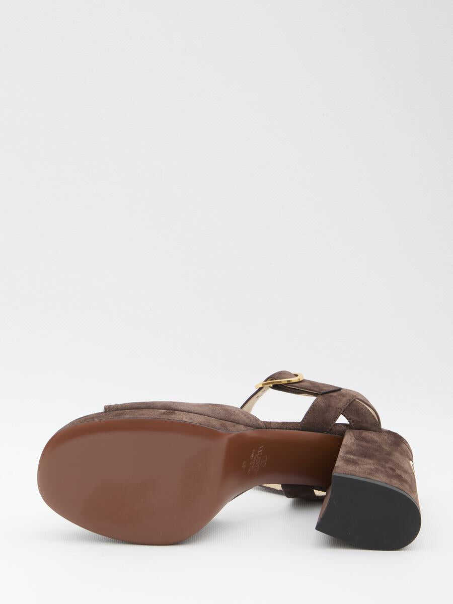 Brown suede Valentino Garavani sandals. Feature an open toe, an adjustable strap, a platform, a block heel, and a VLogo Signature finish on the heel. A dust bag is included.
