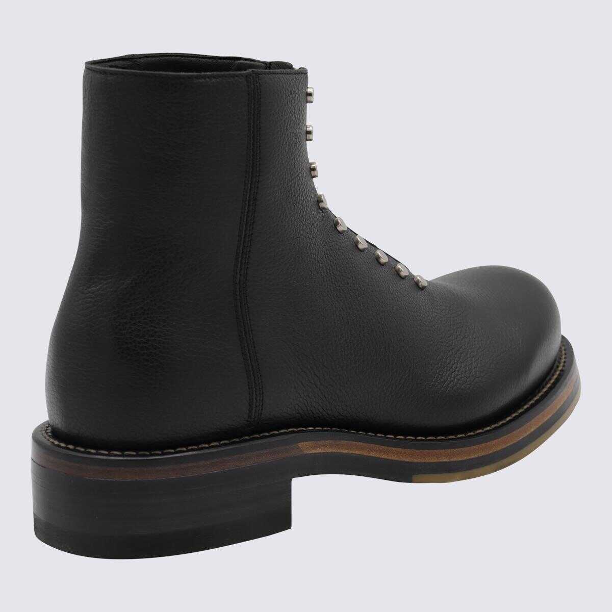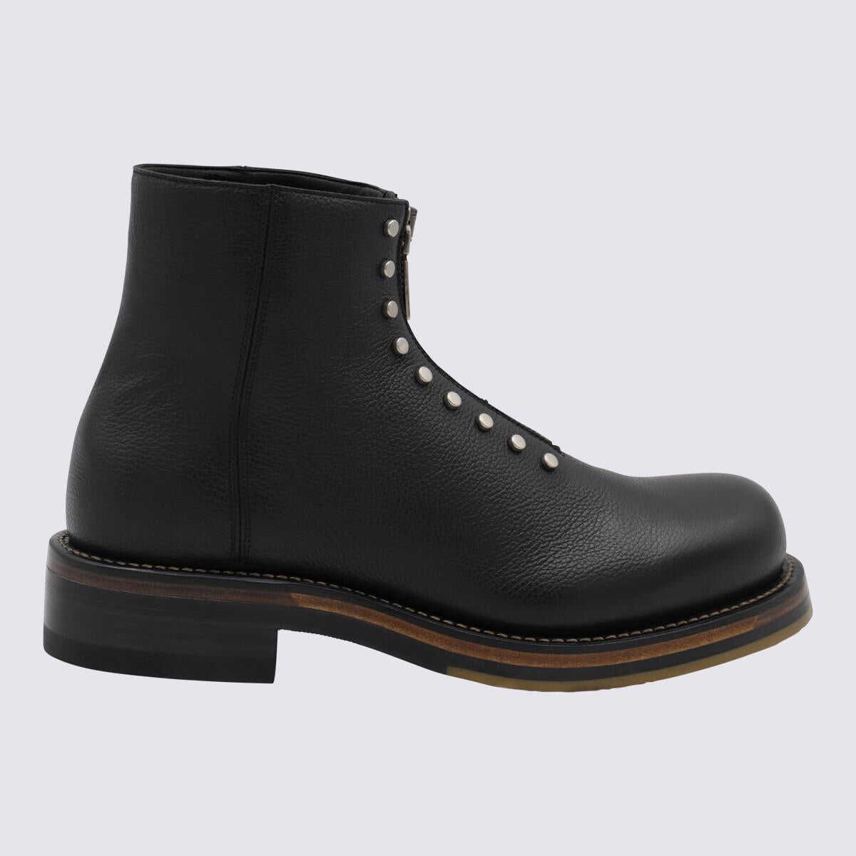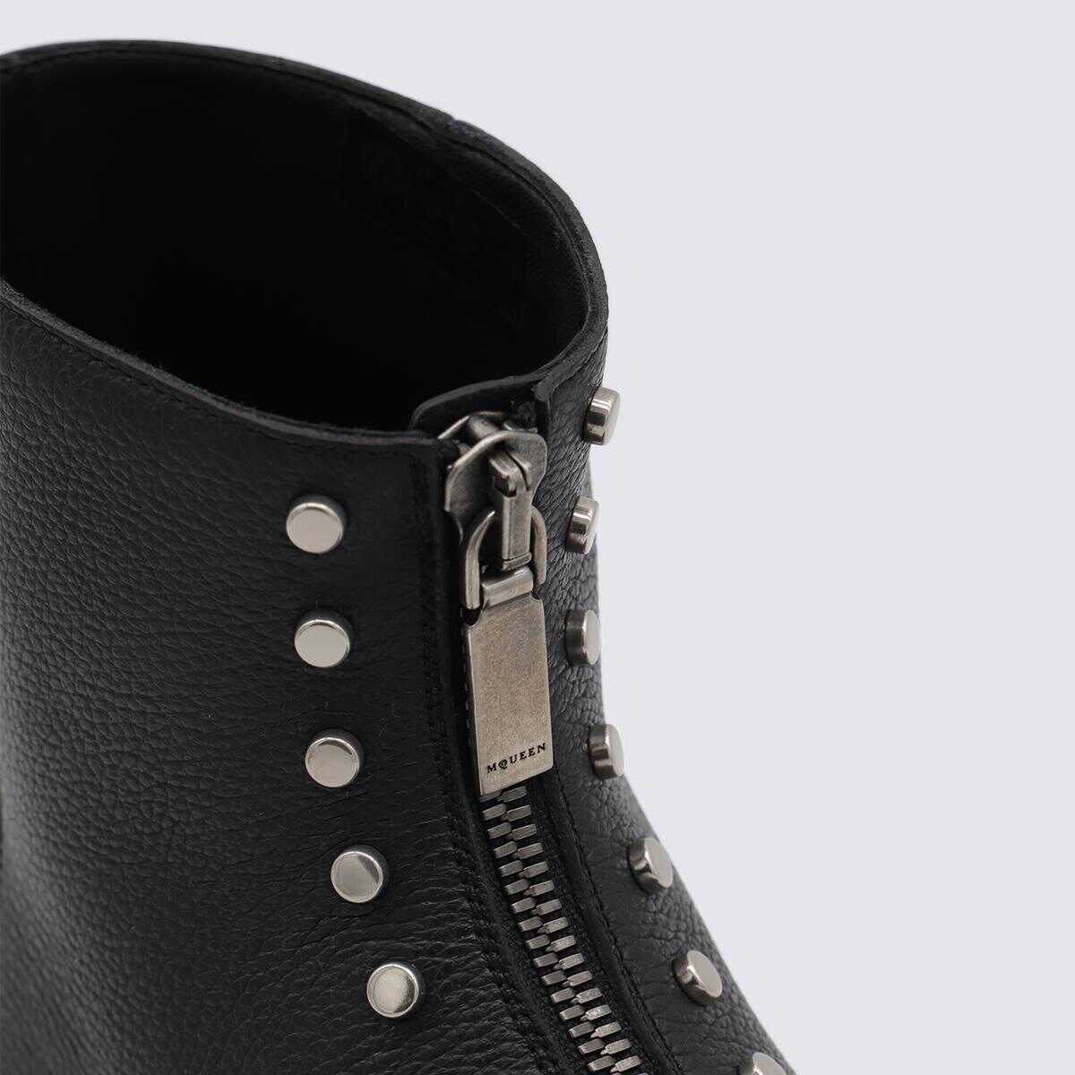 Black leather boots from McQueen featuring round oversize toe, square heel, leather sole and zip fastening.
