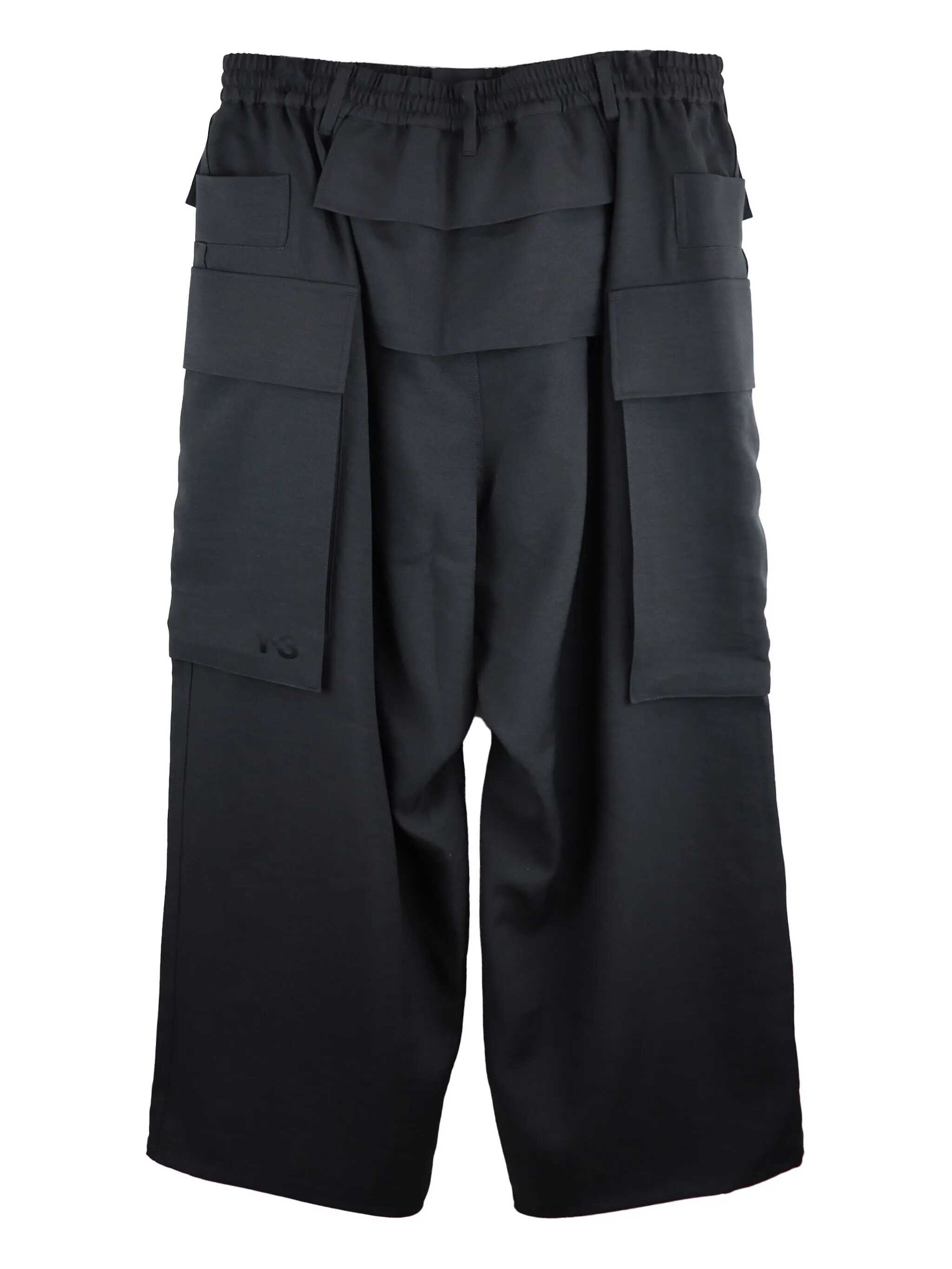 Y-3 cargo trousers made of black technical fabric with a logo print on the side pocket. Featuring an elasticated waistband with drawstring, front button and zip closure, belt loops, multiple pockets, and adjustable drawstrings at the hem.
