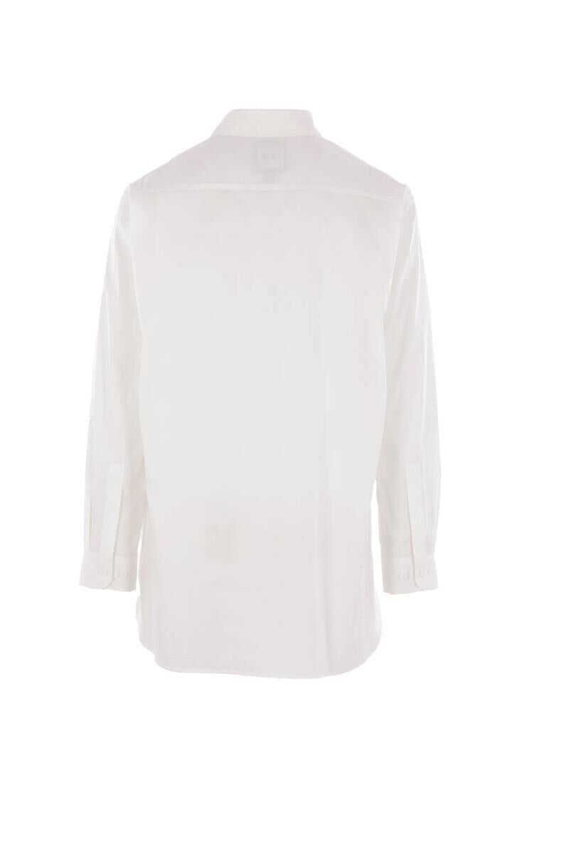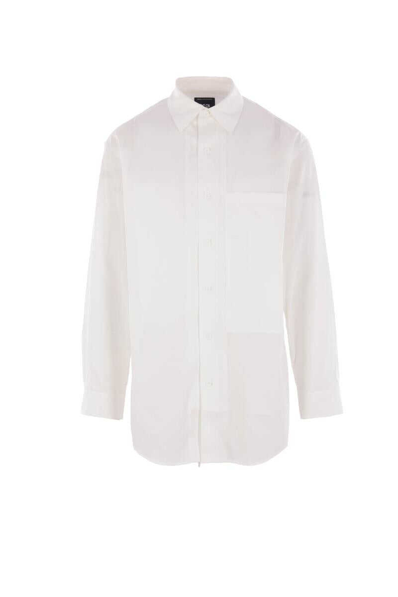 Y-3 shirt made of white stretch cotton poplin. Featuring a classic collar, front button closure, chest patch pocket, long sleeves with buttoned cuffs, and a rounded hem with a tone-on-tone logo print on the front.