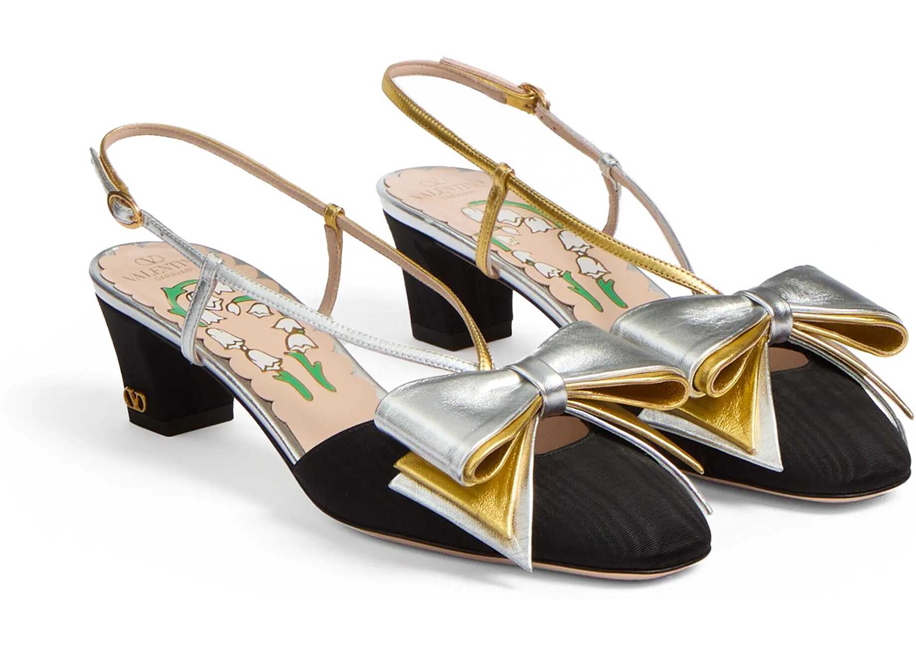 Valentino Garavani's Bowow Pumps reinterpret the classic slingback model with a romantic and distinctive elegance. Made of fine moiré fabric, they are embellished with a laminated nappa leather bow that lends a touch of light and femininity. The heel is decorated with the iconic Signature VLogo detail in antique-effect brass, while the adjustable strap ensures a comfortable and stable fit. The insole, personalized with a delicate floral pattern, completes the design with a refined and sophisticated note.