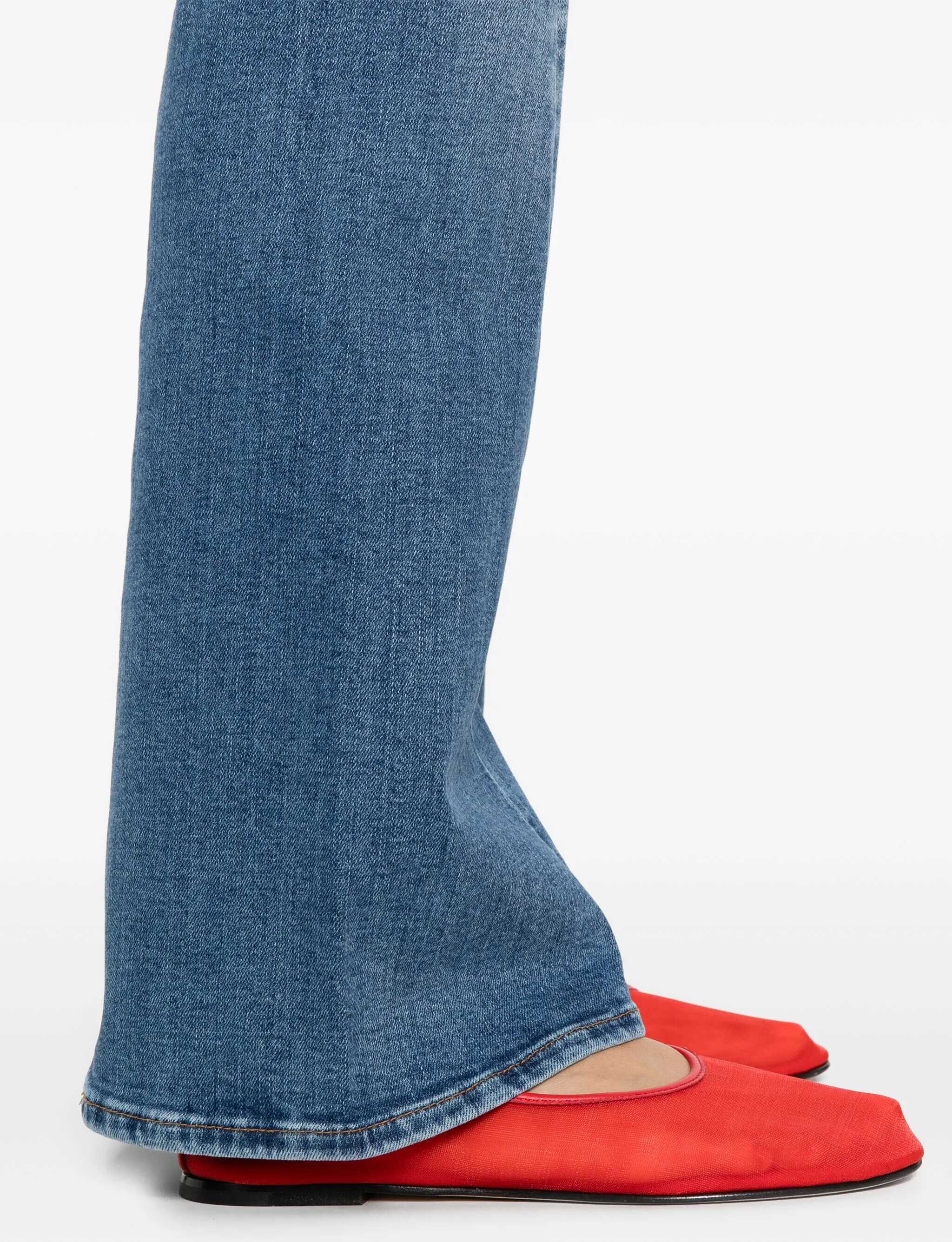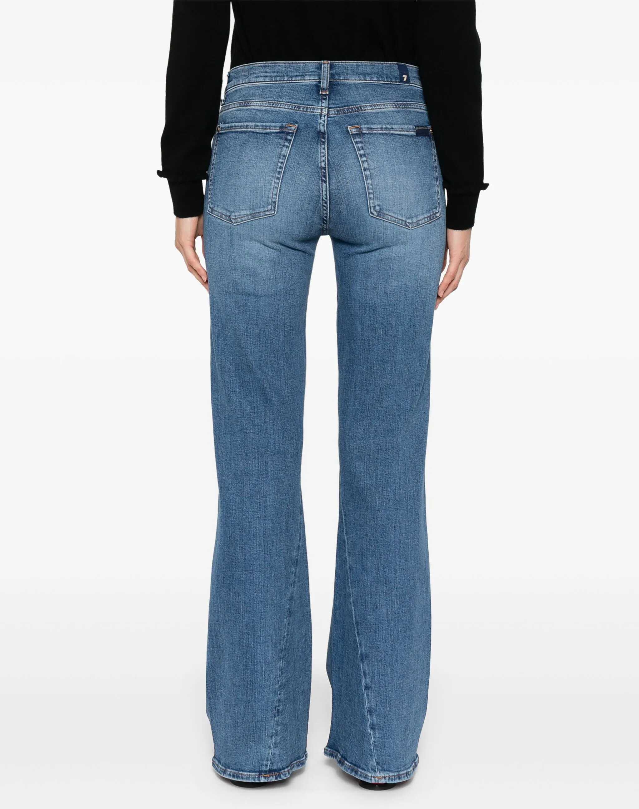 The Dojo Tailorless flare Jeans by 7For feature a mid-rise and a fitted fit on the hips and thighs, opening into a sleek flare from knee to hem. Made from Slim Illusion denim, they offer a shaping effect that enhances the silhouette. A classic five-pocket pattern and zip-and-button closure complete the design.