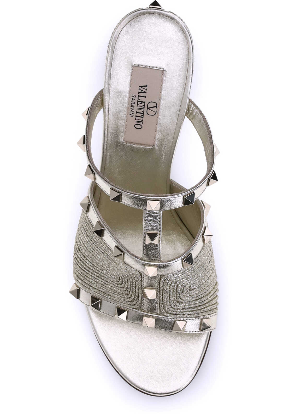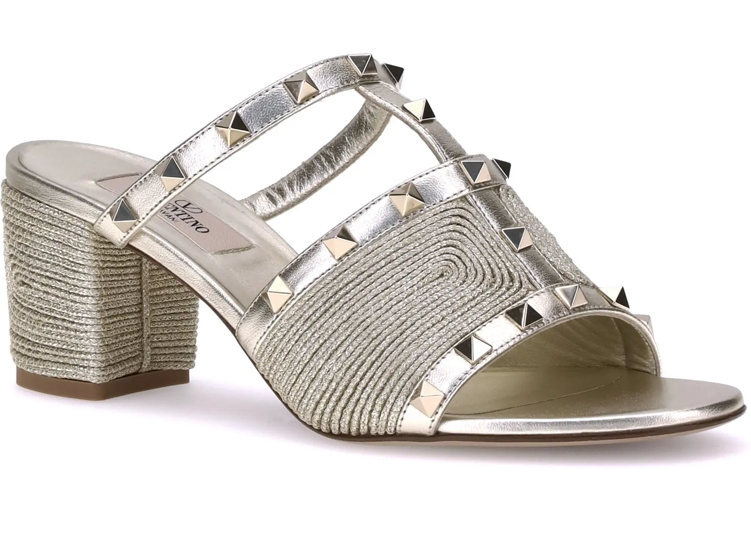 Valentino Garavani's Rockstud Sandals combine handcrafted elegance with the iconic character of the house. Made of calfskin with Cornely embroidery in raffia-effect cotton, they stand out for their refined details and bold style. Platinum-finish studs decorate the leather straps, while the ankle strap is adjustable for a perfect fit. Calfskin trim and an embroidered wide heel complete the design, adding a sophisticated, contemporary touch.