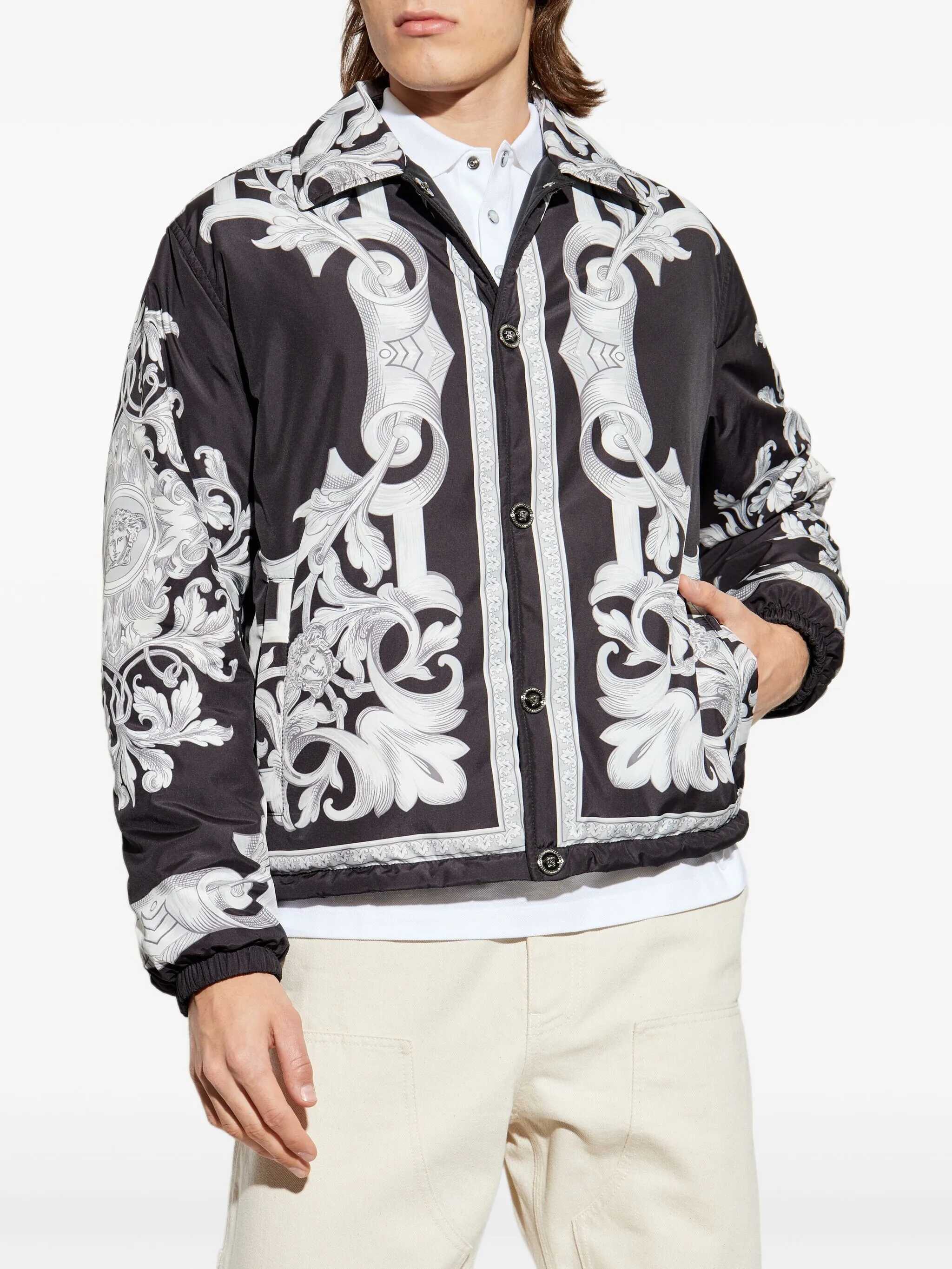 Versace's black reversible jacket with a Baroque print features a snap-button front closure and elasticized hems. It also features two side welt pockets and a drawstring hem for an adjustable fit and versatile style