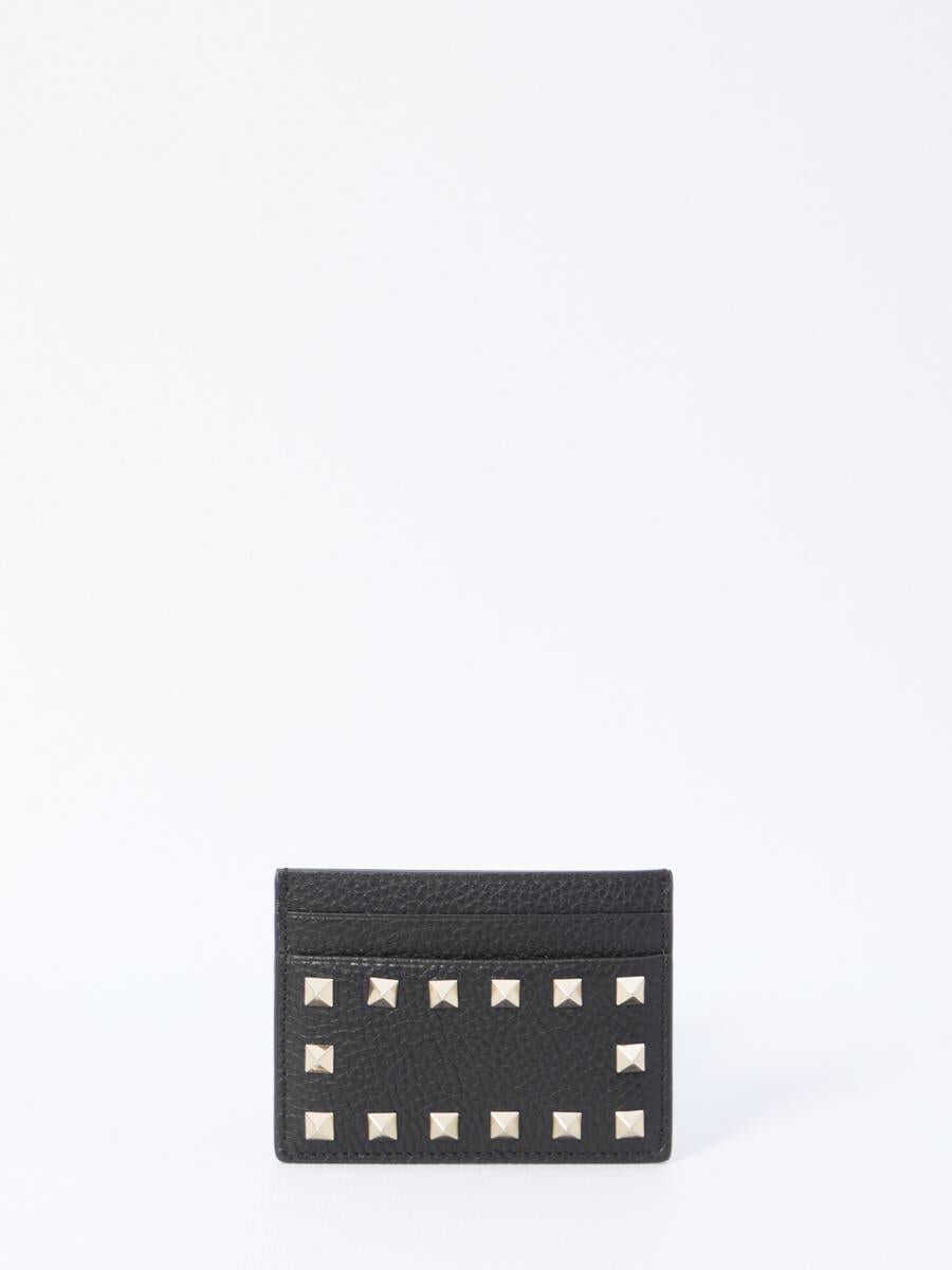 Black calf leather card holder. Features a squared silhouette, iconic platinum-finish studs, four card slots, one inner compartment.