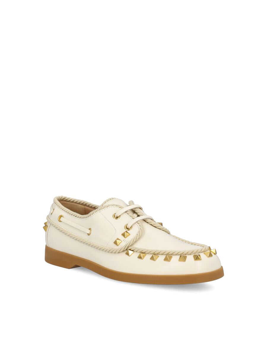 Cream-colored leather Valentino Garavani loafers with rope details and iconic gold Rockstud studs. A combination of navy aesthetic and rock allure, for a bold and sophisticated style - Upper: 100% calfskin - Color: brown - Studs applied on the upper - Rubber sole - Leather lining - Made in Italy - Box included - Item code: 6W2S0LR5TKZKG8