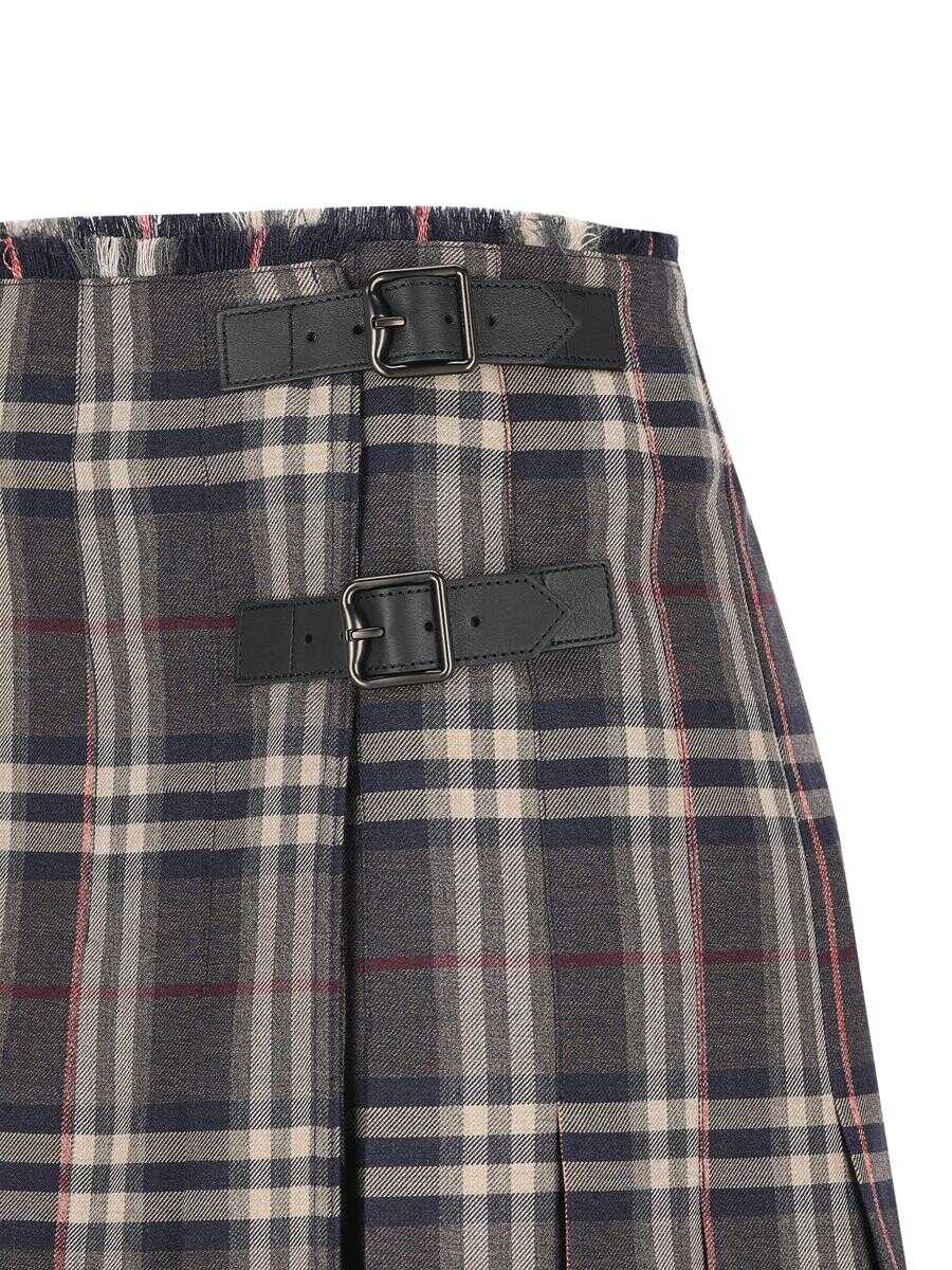 Burberry wool mini kilt with Check pattern in Fig/Black Amethyst tones. An iconic garment that combines tradition and contemporary style, ideal for a sophisticated and distinctive look. - Material: 100% wool - Color: gray - Finish: 100% calfskin - Buttons: buffalo horn - Short, thin bangs at waist - Burberry lettering engraved on buckles - Short, thin bangs at waist - Burberry Check all-over motif - Item number: 8110427C3127