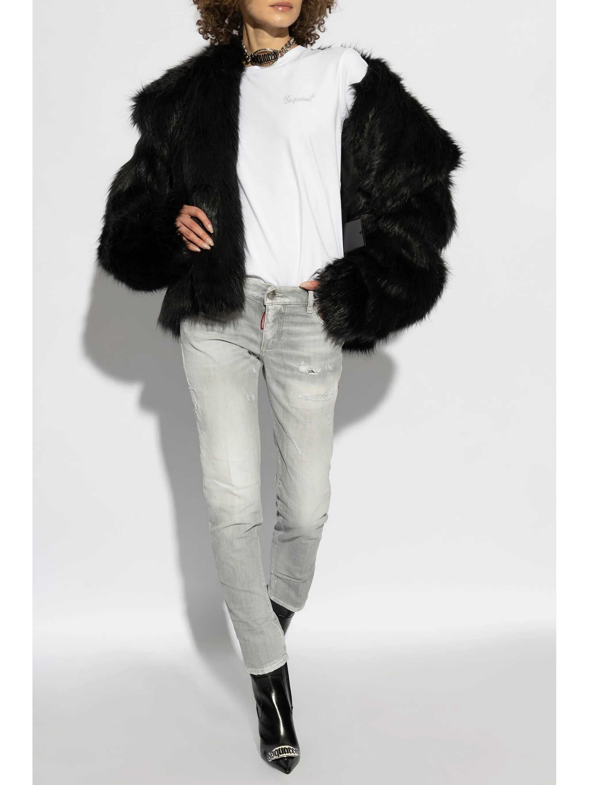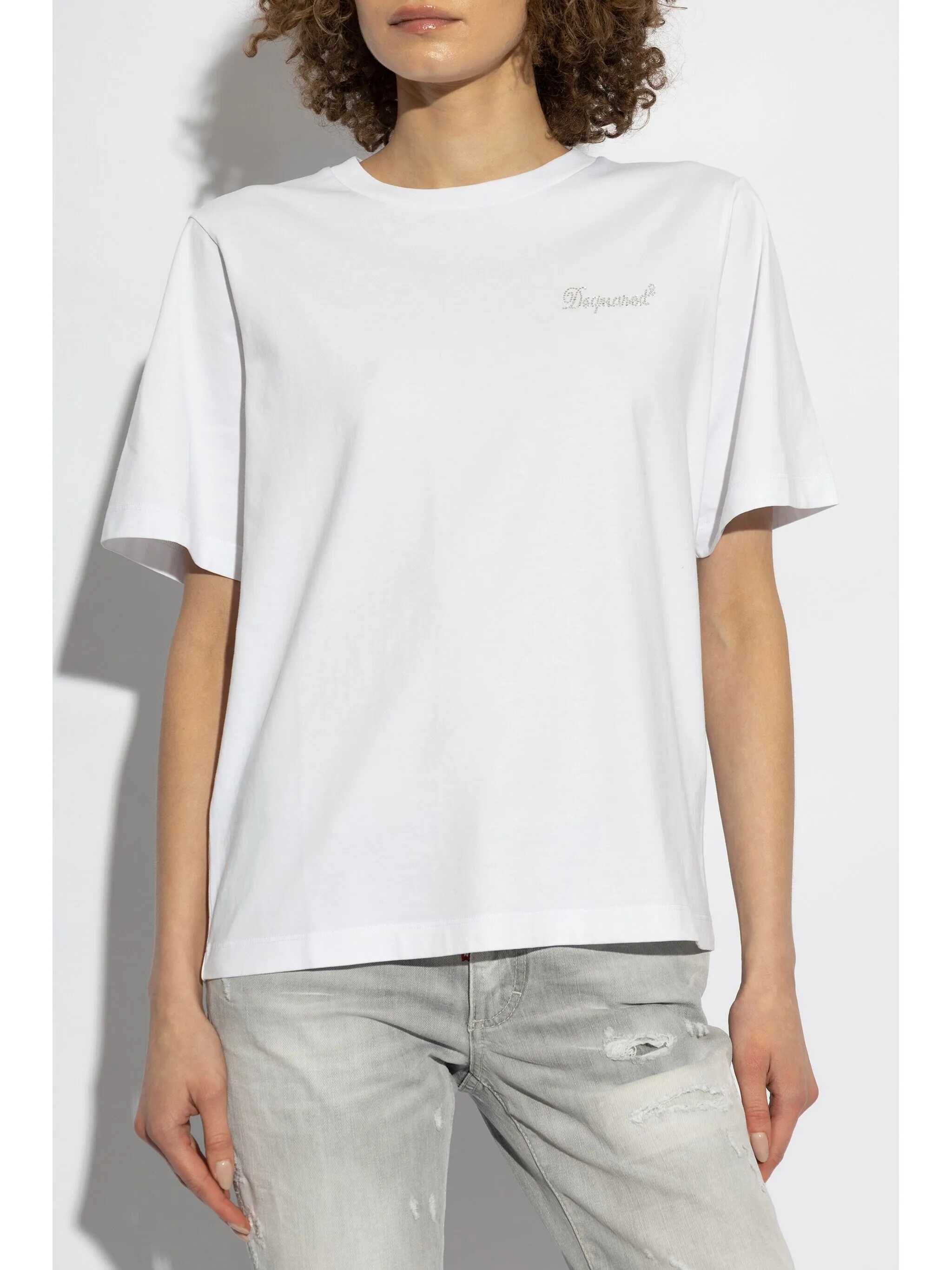 Dsquared2 t-shirt made of white cotton. Ribbed crew neck. Short sleeves. Silver rhinestone logo lettering on the chest.