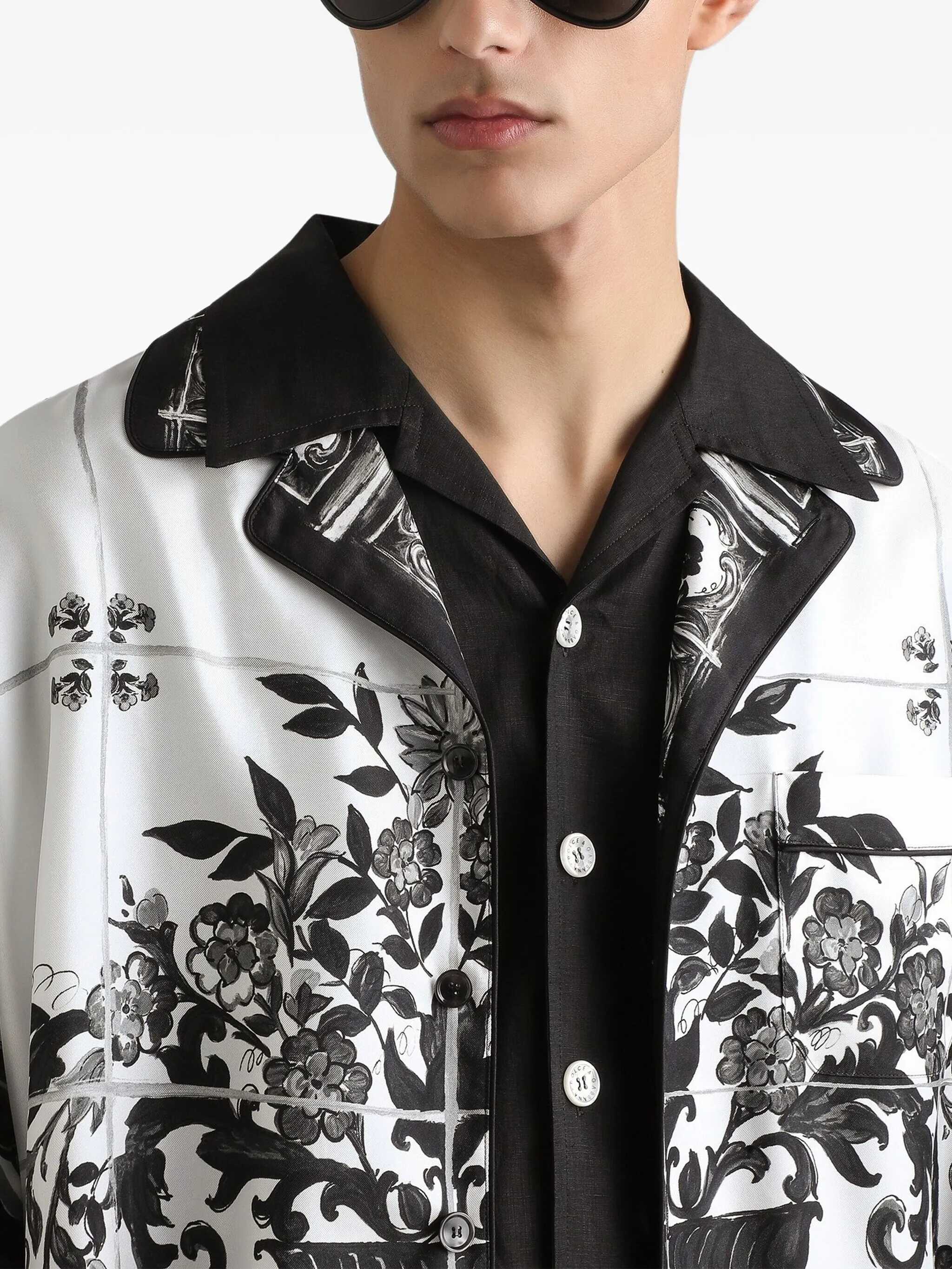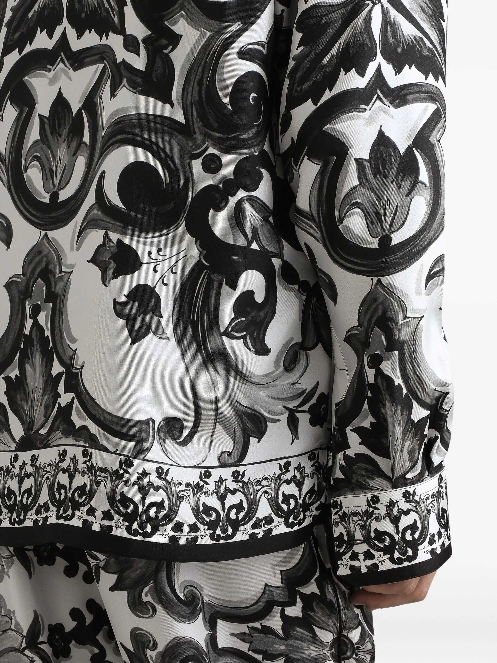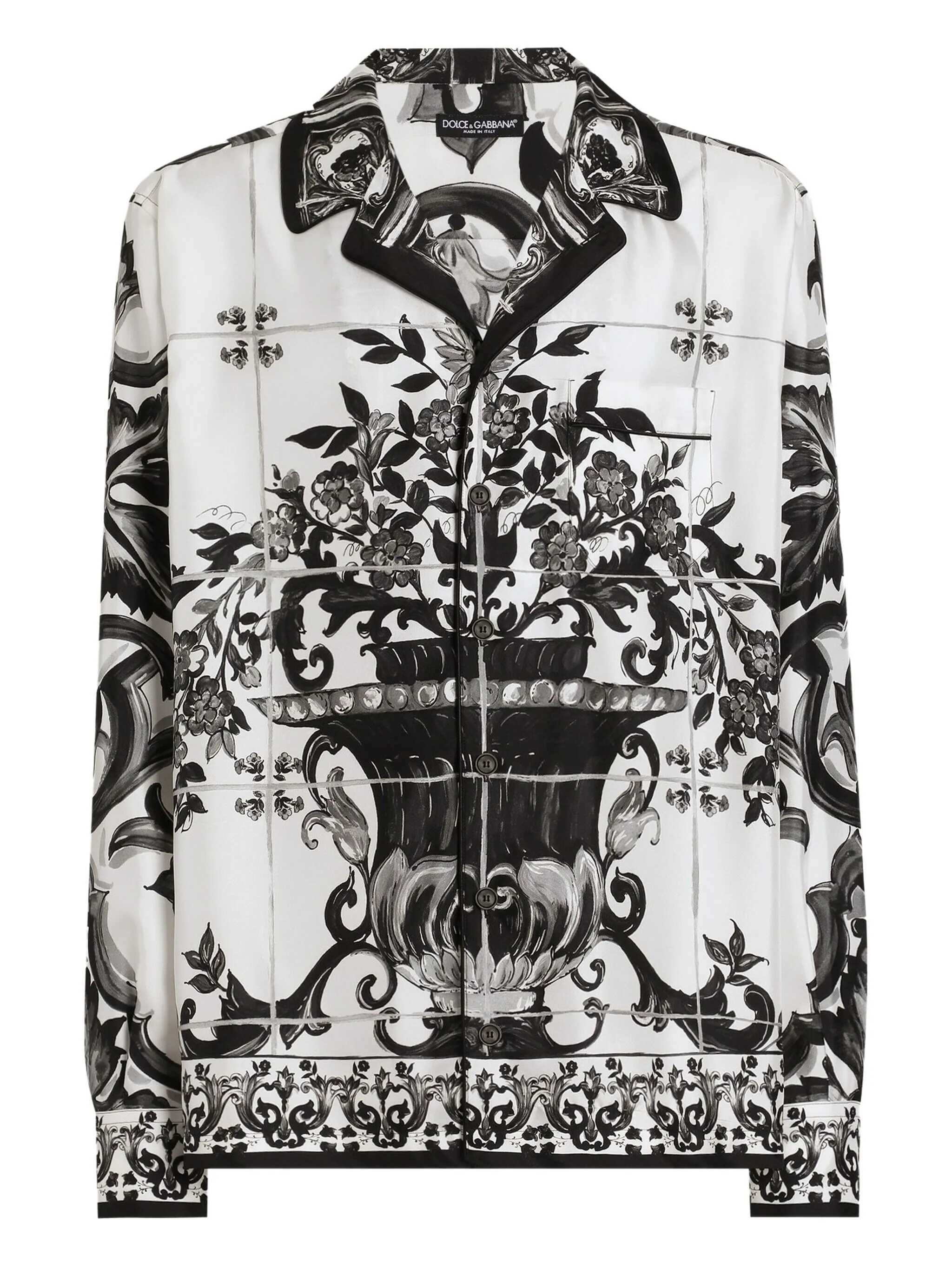 'Vanity' silk twill shirt with 'Maiolica' print, front button closure, breast pocket, long sleeves with cuffs and shoulders slightly, side slits.