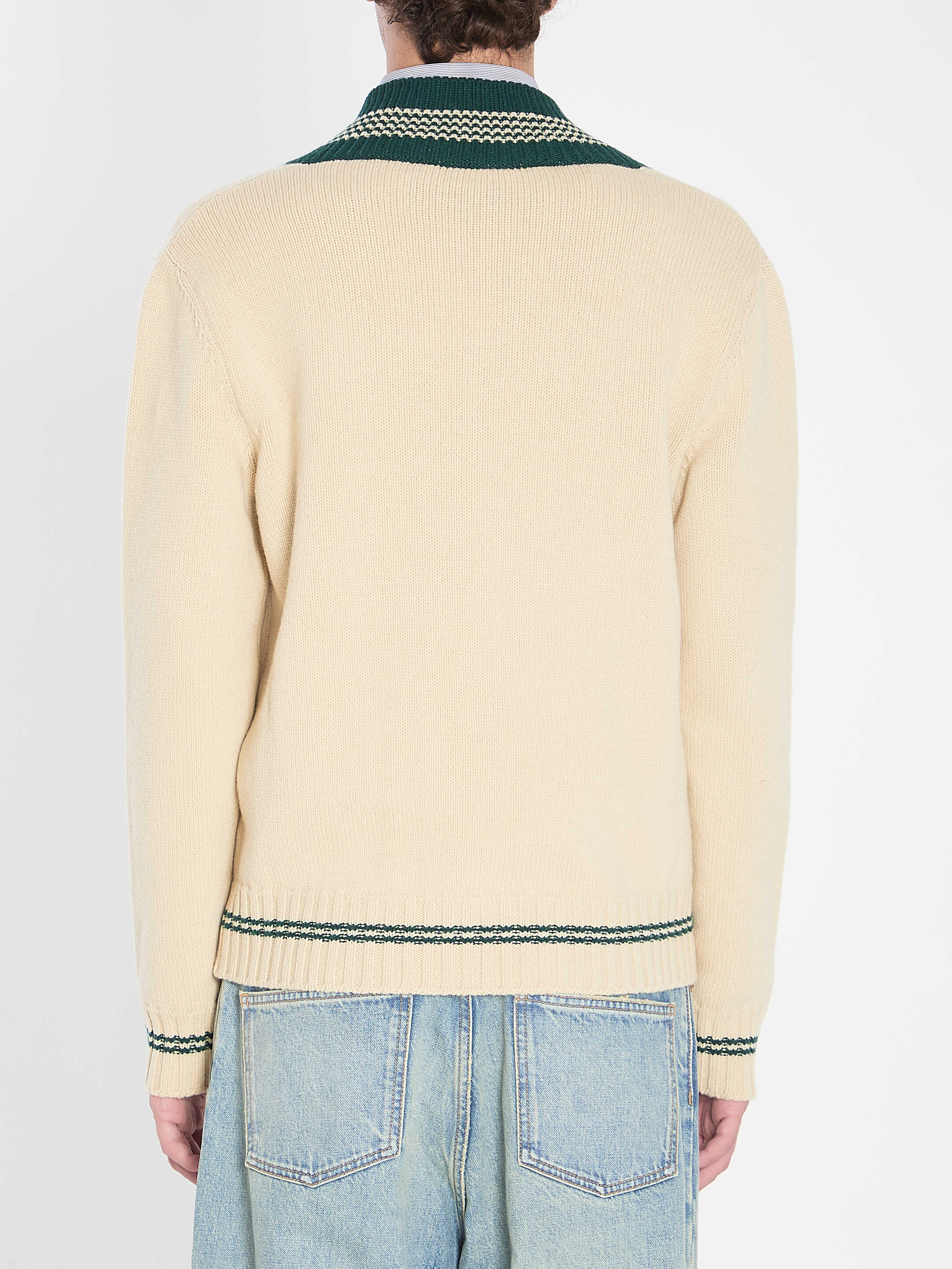 Sweater in butter-colored virgin wool. Features a V-neck with contrasting green details, long sleeves, Le Chien de la Maison embroidery on the chest, and ribbed striped trims.