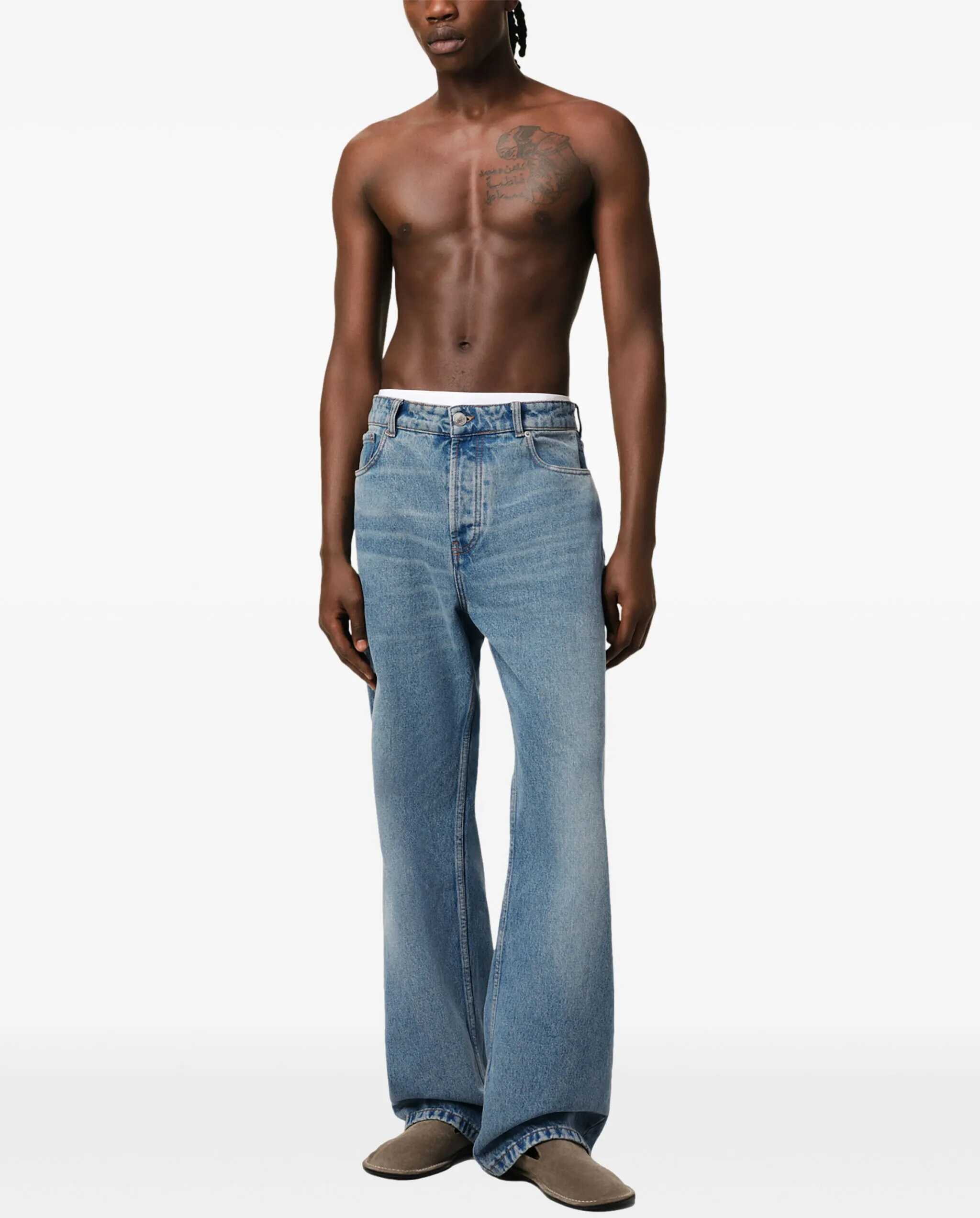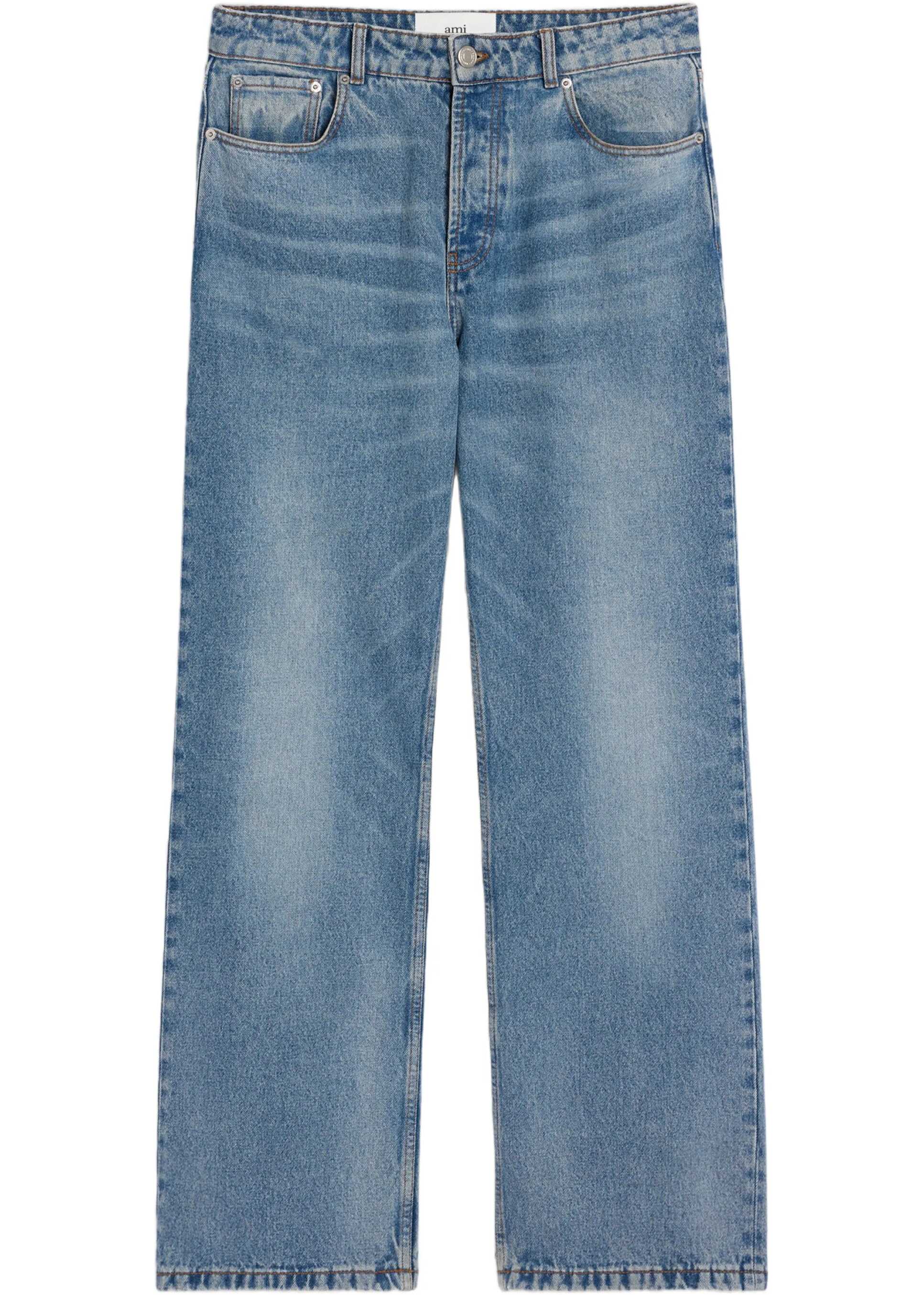 Jeans in indigo denim. Featuring a wide fit, "used" effect, wide leg, button closure, five-pocket design, metal rivets and buttons, "ami alexandre mattiussi" patch on the back, and tobacco-colored topstitching.