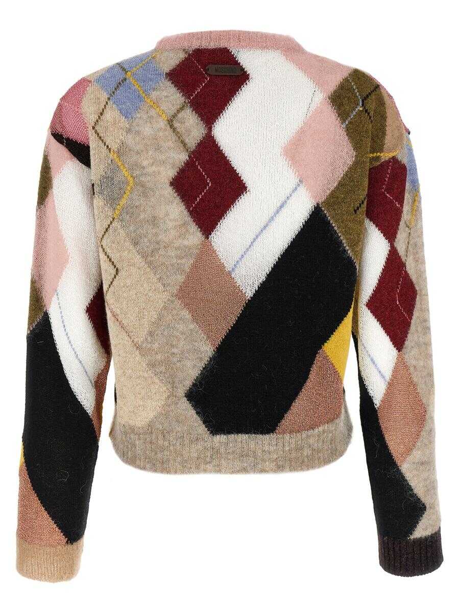 Sweater in brushed mohair blend inlaid with lurex threads and diamond pattern, round neckline, long sleeves with cuffs and dropped shoulders, back leather logo patch