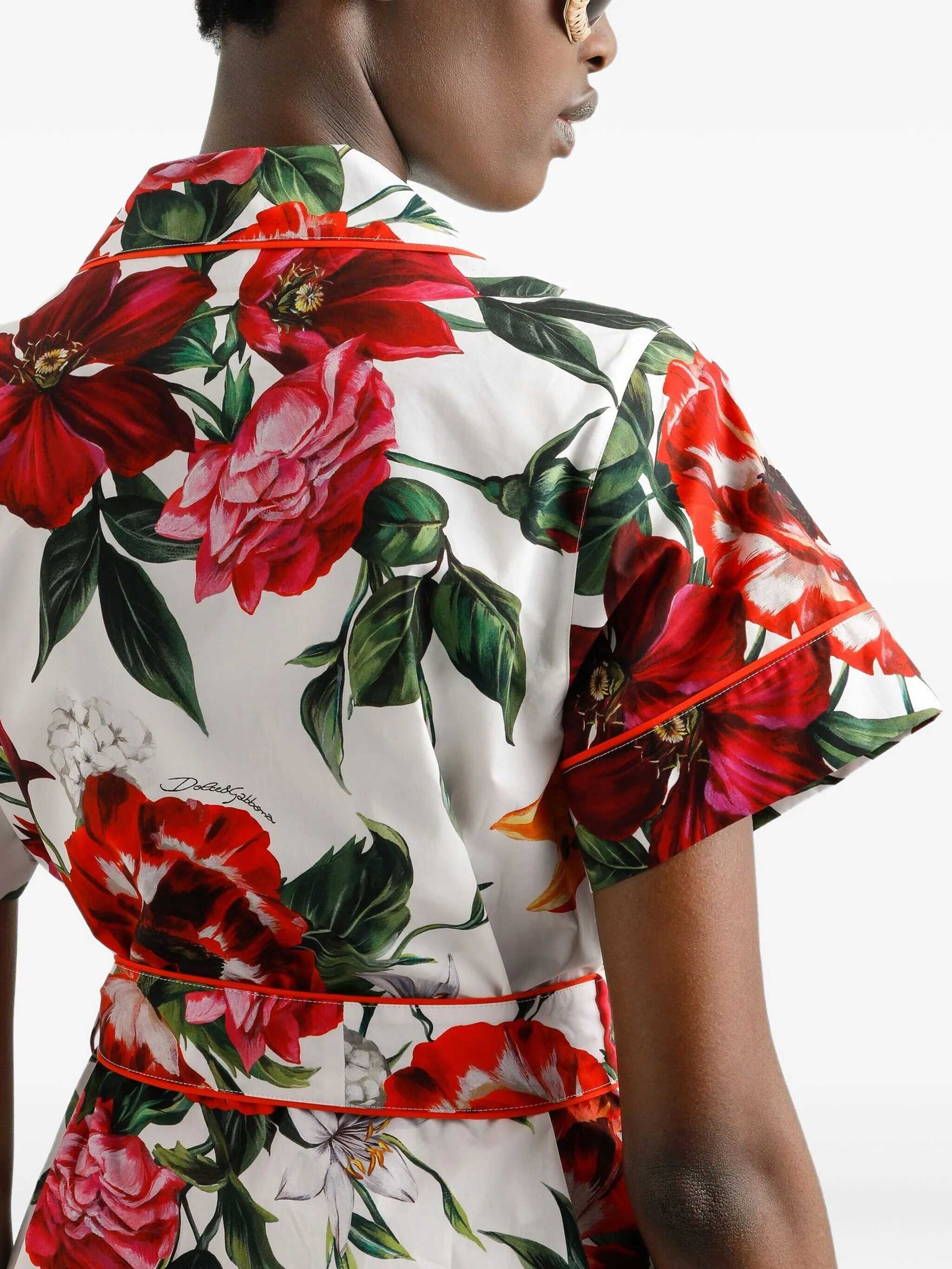 Bouquet print cotton poplin shir Vanity t with contrasting piping, pajama style, V-neck, front button closure, breast pocket, short sleeves, side slits, and removable belt.