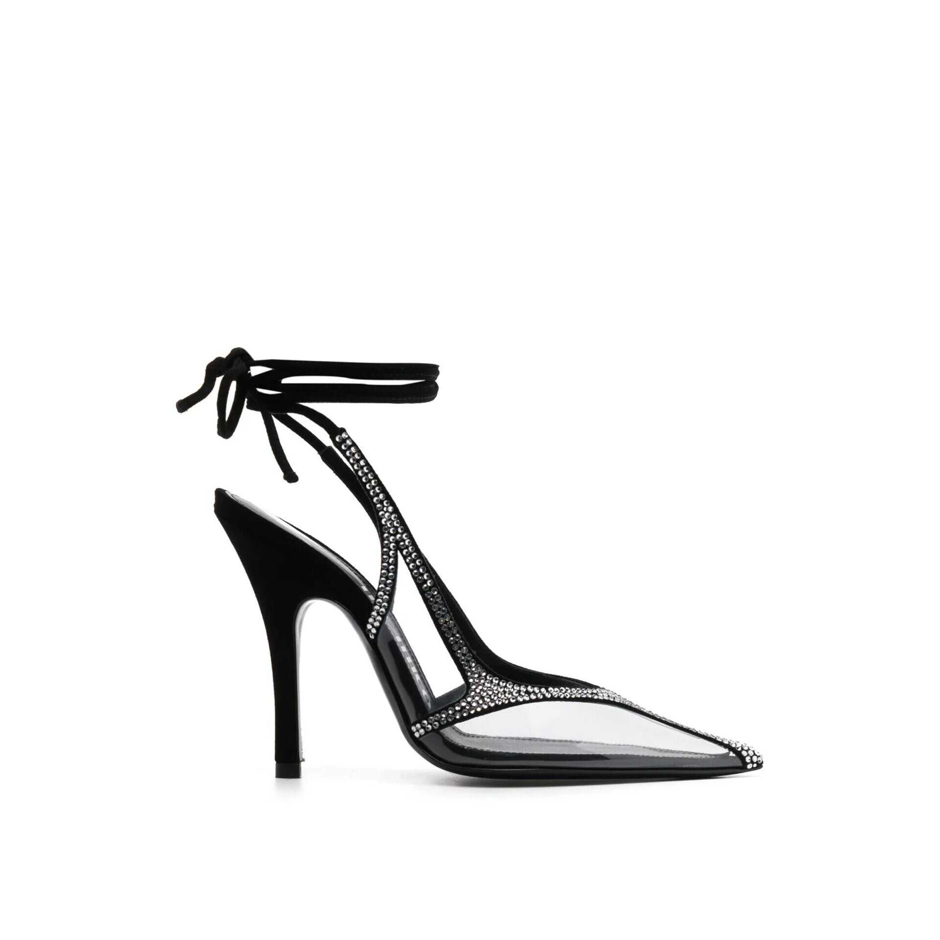 - Composition: 50% PVC 50% calf leather - Inner: Leather - Insole: Leather - Sole: Leather - Suede detail - Pointed toe - Branded insole - Heel 10,5 cm - Decoration with rhinestones - Transparent PVC inserts - Adjustable ankle lacing - Made in Italy - Gender: WOMEN - MPN 236WS739L075T_212 - Code: SHO TT 2 PM SS25 13664