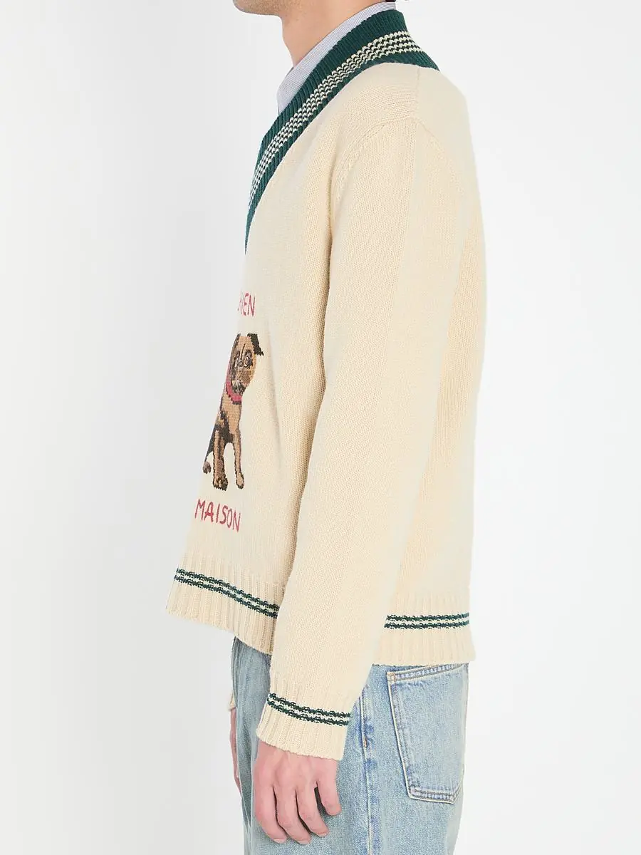 Sweater in butter-colored virgin wool. Features a V-neck with contrasting green details, long sleeves, Le Chien de la Maison embroidery on the chest, and ribbed striped trims.