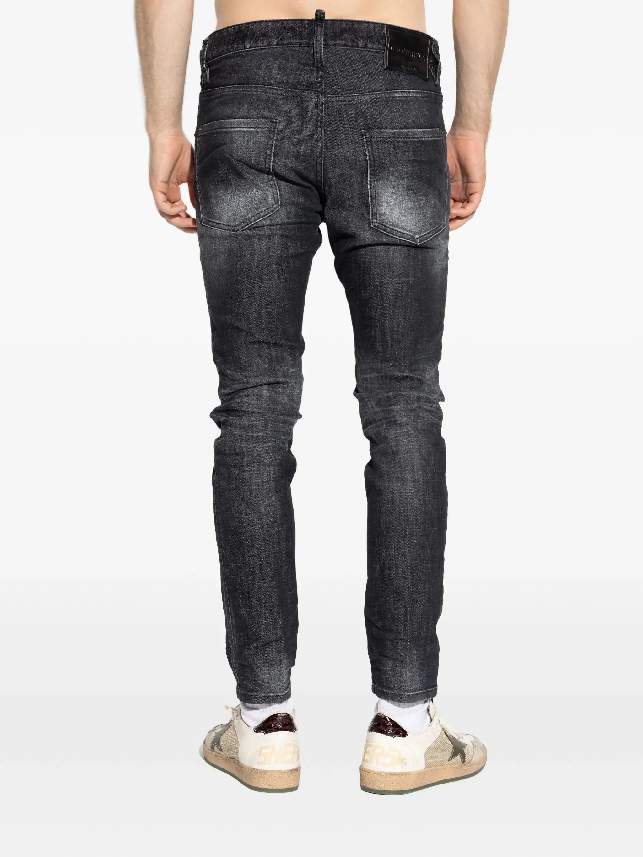 'Skater' stretch cotton denim jeans with used-effect details, button closure, five leather logo pockets