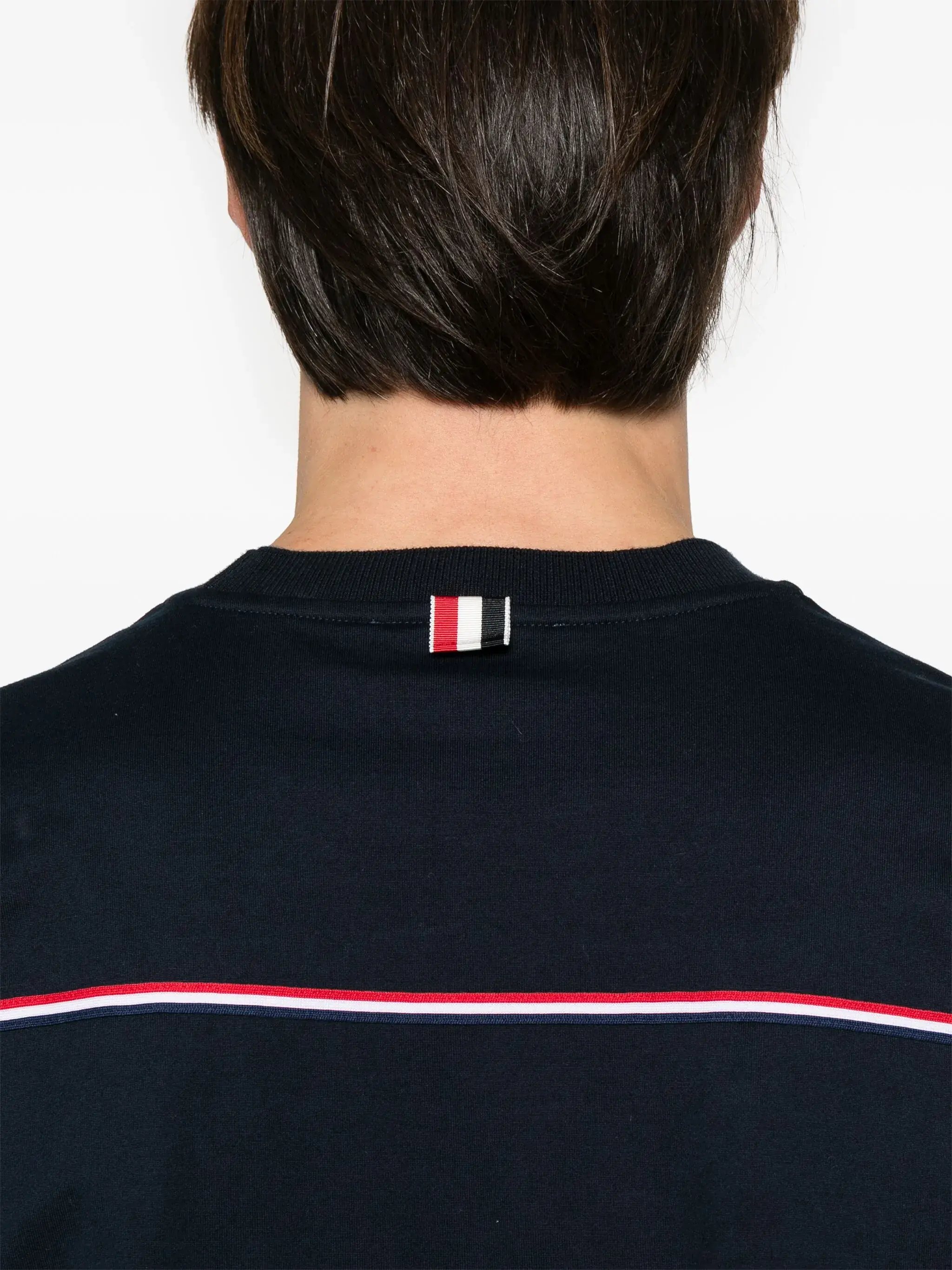 Thom Browne's oversized T-Shirt combines an essential aesthetic with distinctive details. Made with a ribbed crew neck, it features two side slits that add comfort and movement. An iconic patch stands out on the front, while colorful bands on the back lend an unmistakable touch, discreetly signing off the brand's style.