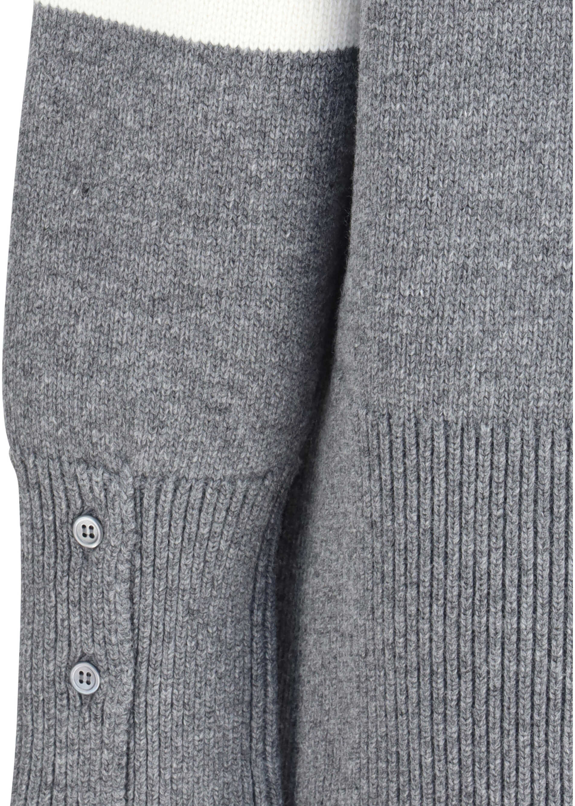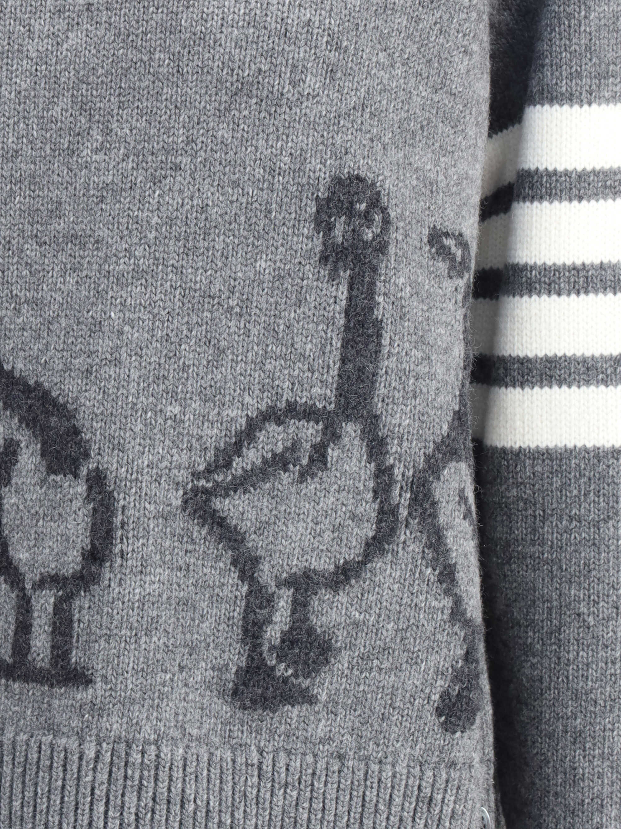 Thom Browne's wool Geese Sweater is an original and sophisticated piece that reflects the brand's signature style. Made from soft wool, it features a ribbed crew neck and cuffs, while the asymmetric hem adds a contemporary touch. The iconic bands on the left arm and side buttons lend character and recognition to the design. On the front, the design of three stylized geese stands out, a distinctive graphic element that gives the sweater a playful and sophisticated elegance.