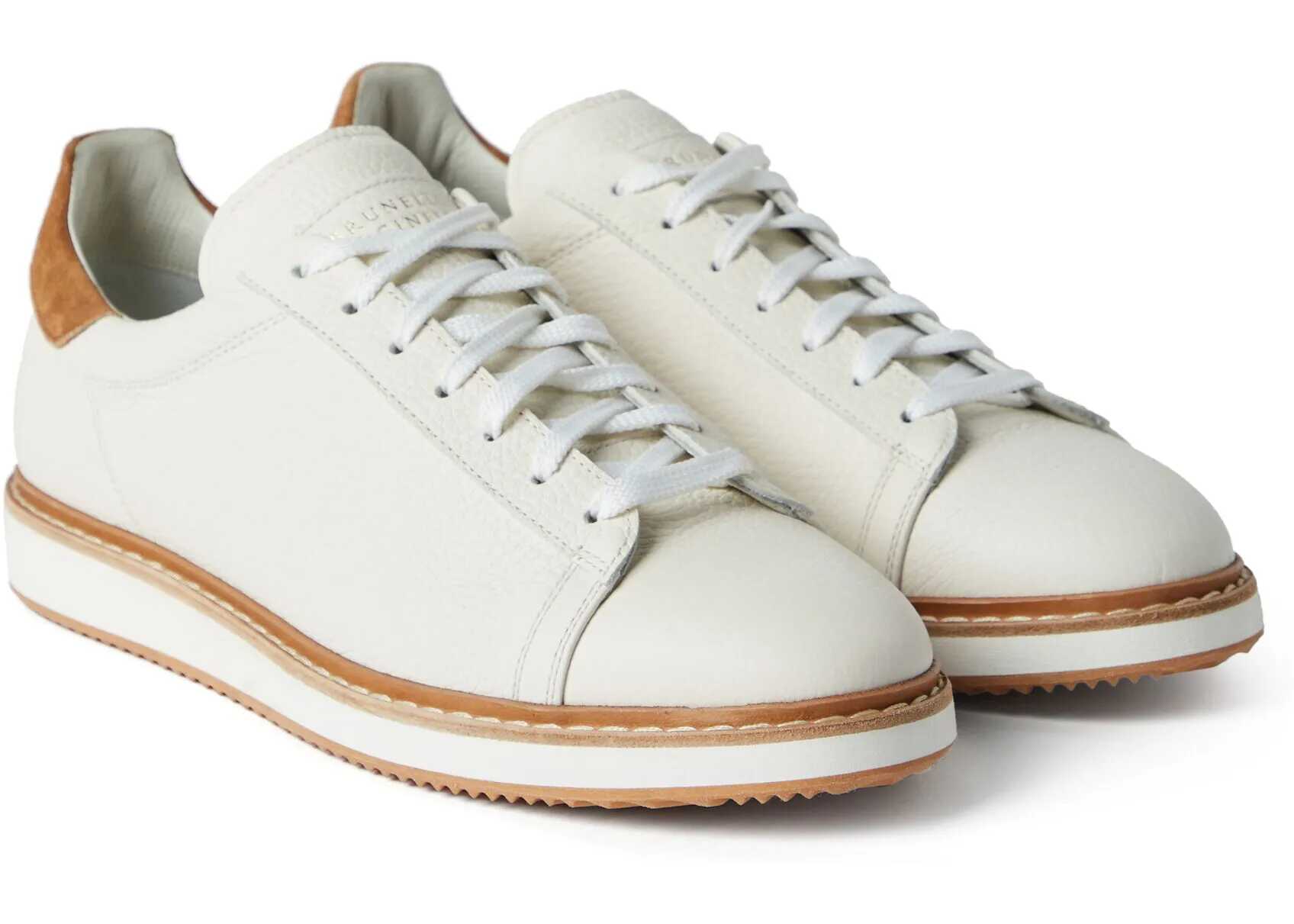 Brunello Cucinelli's Leather Sneakers offer a refined interpretation of casual taste, renewing each season with sophisticated leathers and nuances. The rich texture of grained calfskin is enhanced by the contrasting back tab detail in soft suede. The ultra-light Micro bottom ensures optimal wearing comfort. The calfskin leather, characterized by a noticeable and homogeneous grain, enriches seasonal shades with a full and luxurious visual effect.