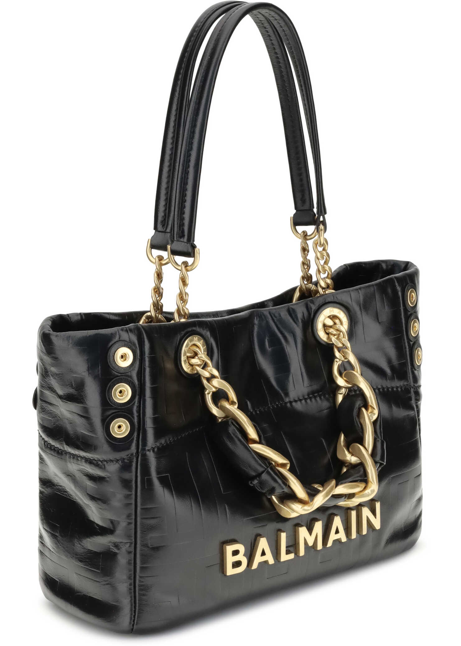 Cracked-effect leather 1945 Small Tote Bag by Balmain features double top handles: two chain-detailed and two leather handles with chain details for a mix of style and versatility. The front features an applied metal monogram, the brand's distinctive symbol. Adjustable side gussets with three contrasting snap buttons allow you to change the capacity of the bag. The top closure with a magnetic button ensures practicality and security. Inside, a single large compartment provides functional space for essentials. A stylish and contemporary accessory, perfect for completing any look with personality.
