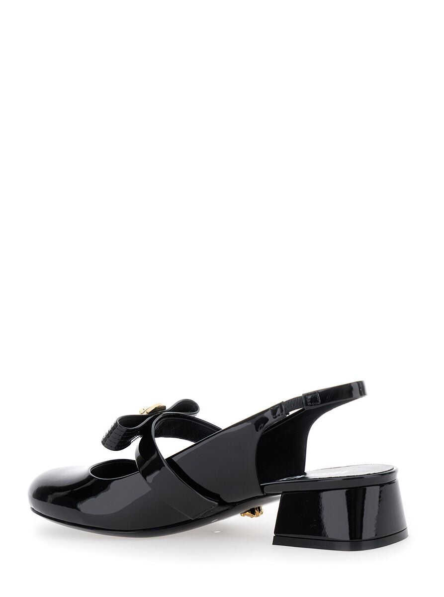 black calf leather patent finish low block heel elasticated slingback strap signature Medusa Head buttons bow detailing round toe branded leather insole leather and rubber sole