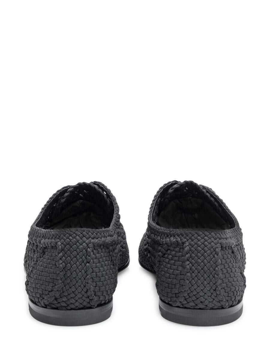 Black fabric shoe with woven workmanship. Calfskin leather fussbett with logoed label. Logo-embossed leather sole.