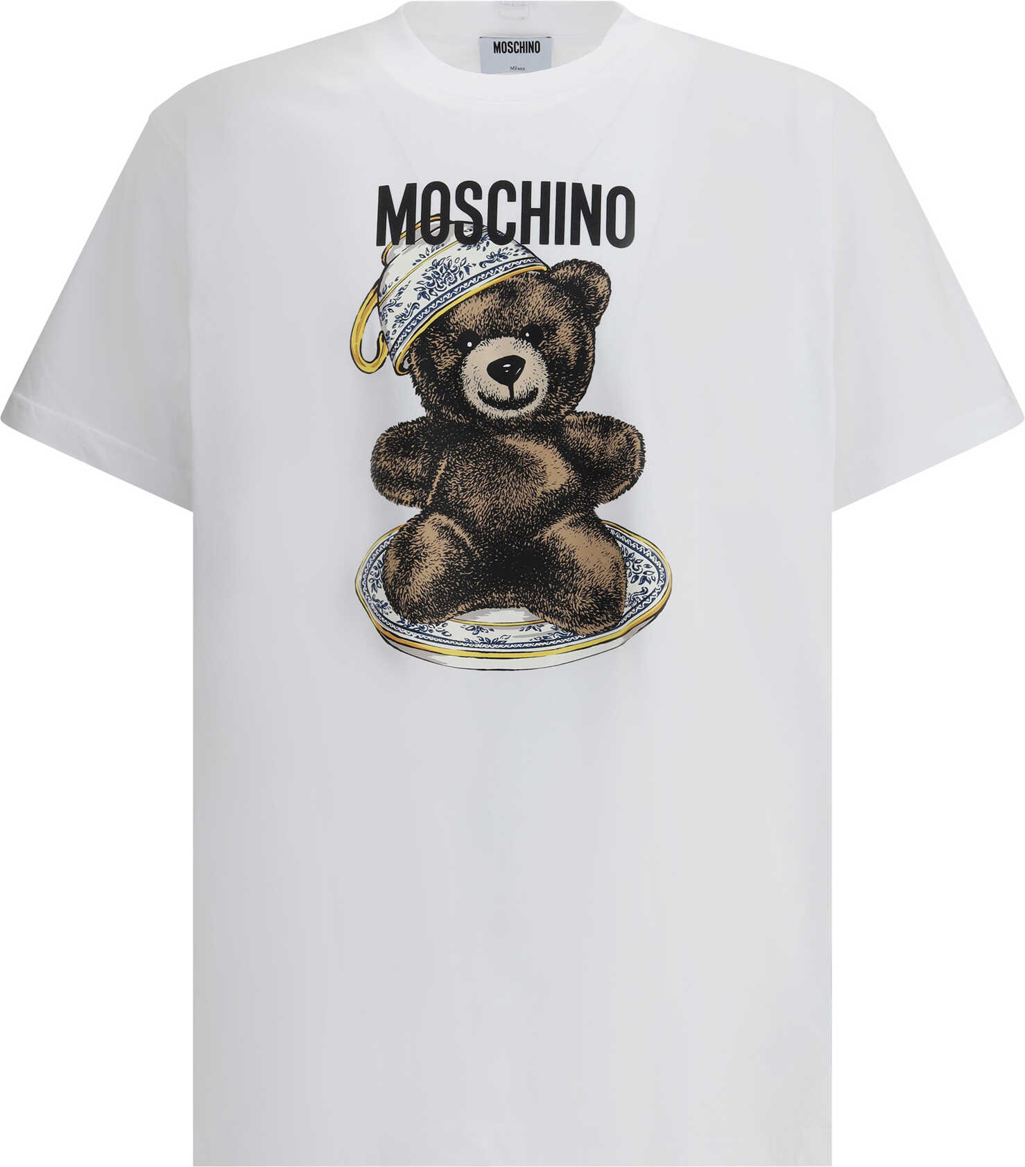 Moschino's cotton T-Shirt stands out for its distinctive and bold design. The maxi bear print on the front adds a playful and recognizable touch, making the garment instantly identifiable. The brand's iconic monogram, applied in contrast, reinforces Moschino's identity with an elegant and dynamic detail. The ribbed crew neck ensures a comfortable and perfect fit, while the monochrome pattern makes the T-shirt versatile and easy to match.