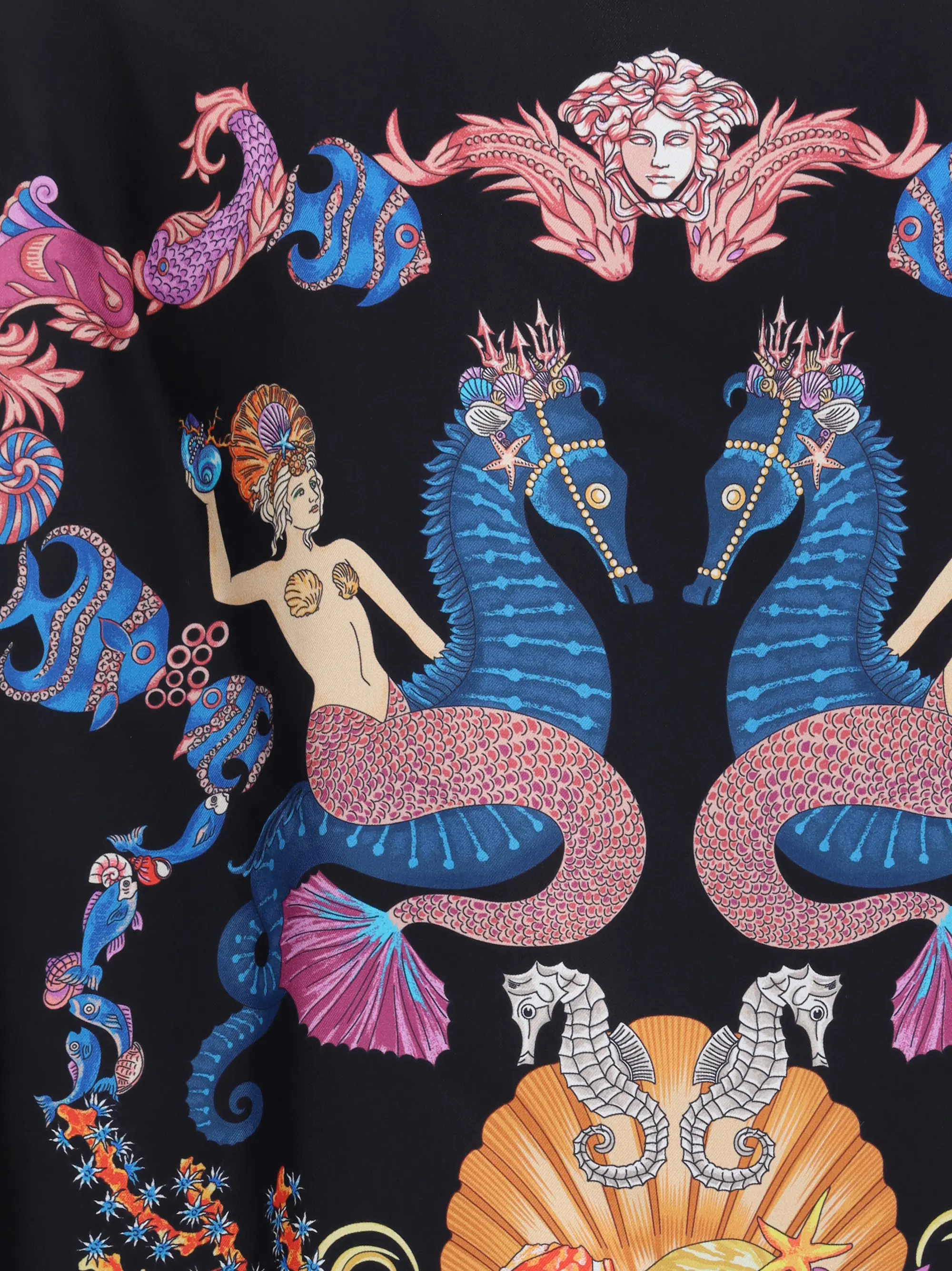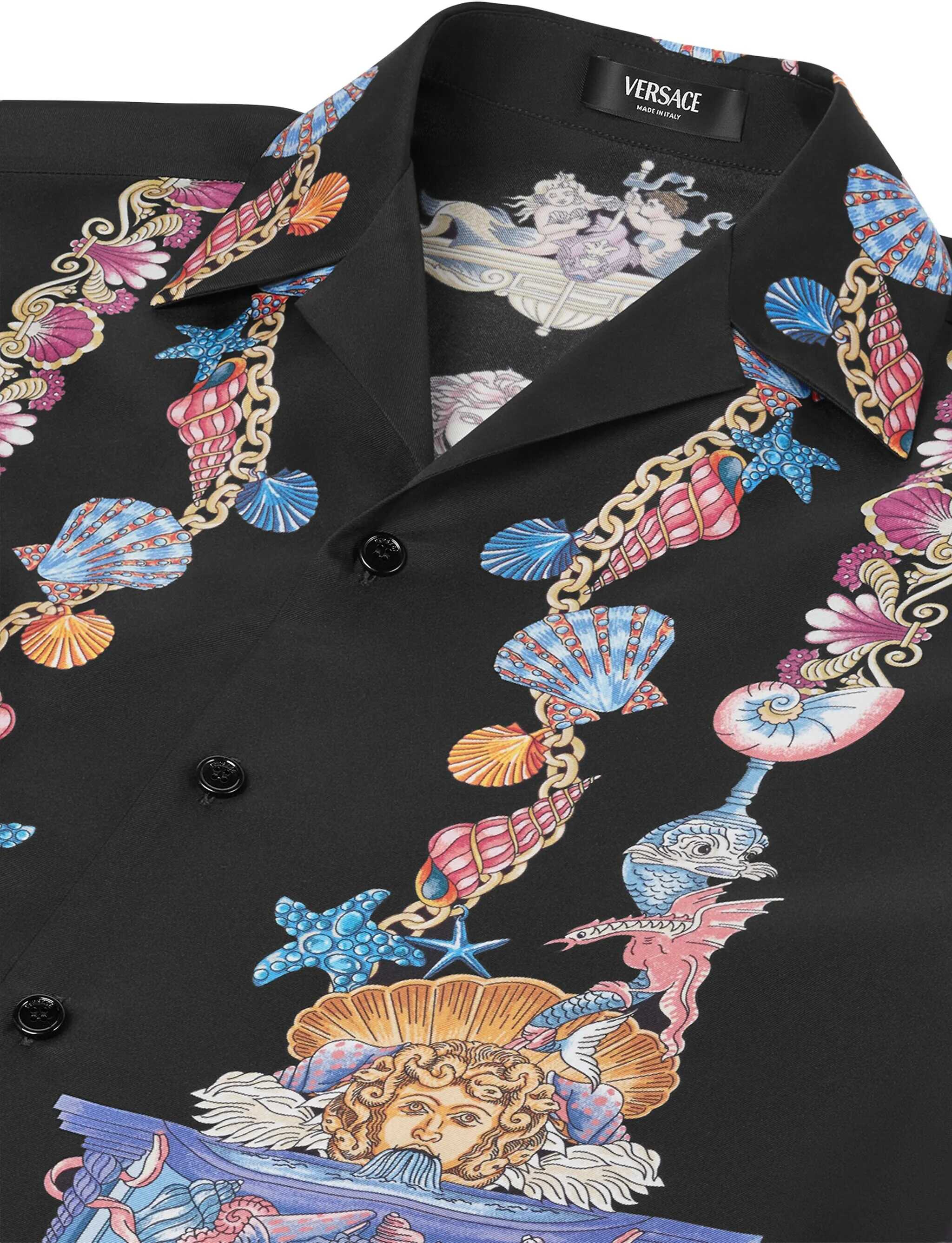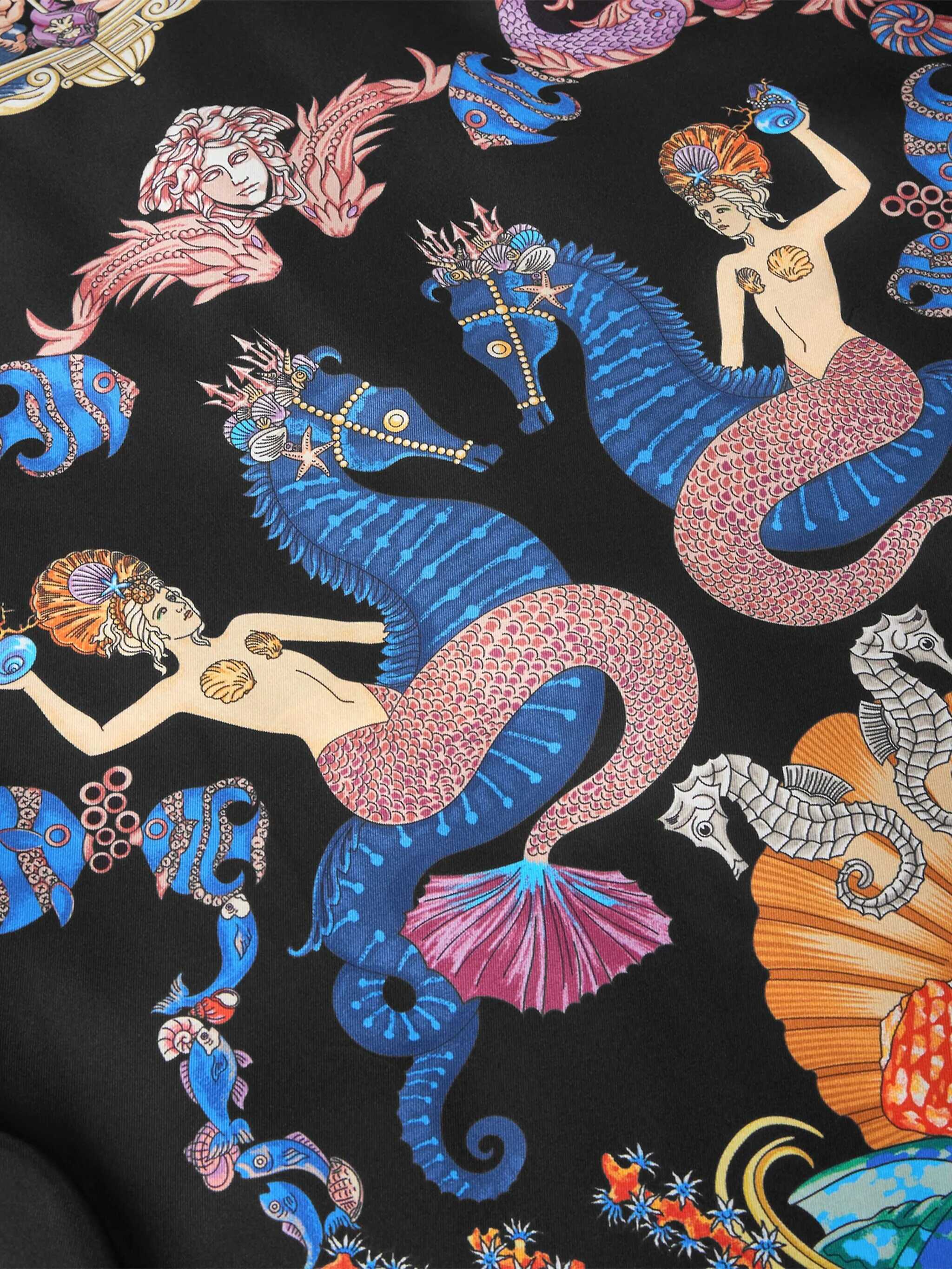 Versace's silk Theatre Shirt is a short-sleeved design with a Cuban collar and front button closure. The exclusive print depicts corals, shells and mermaids, enhanced by theatrical elements that express the Maison's deep connection with the dramatic arts. Two side slits complete the design for a fluid and refined fit.