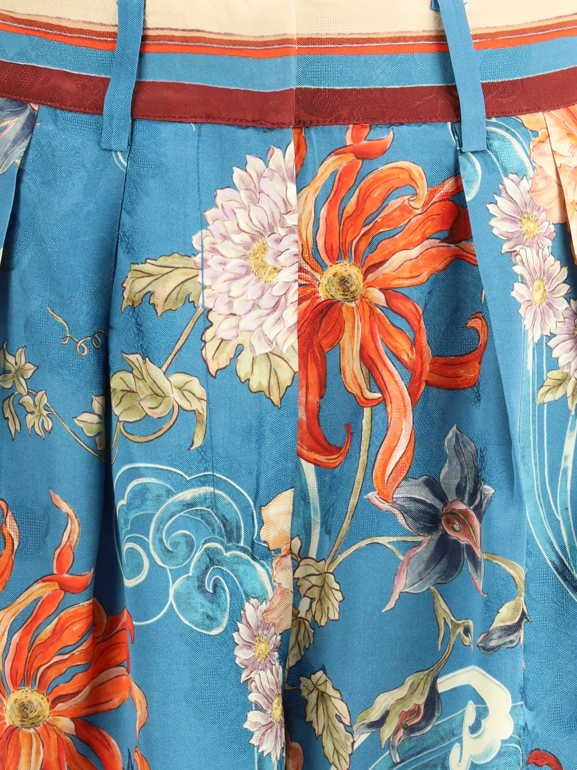 Alémais' Fletcher Pants are made of a fine satin fabric with a vibrant dahlia print in shades of red and pink. Featuring a wide-leg silhouette and high waist with pleats, they combine elegance and comfort. The front closure is concealed with hook and zipper, while burgundy and pink side stripes add a graphic and modern touch. Practical side pockets complete the design.