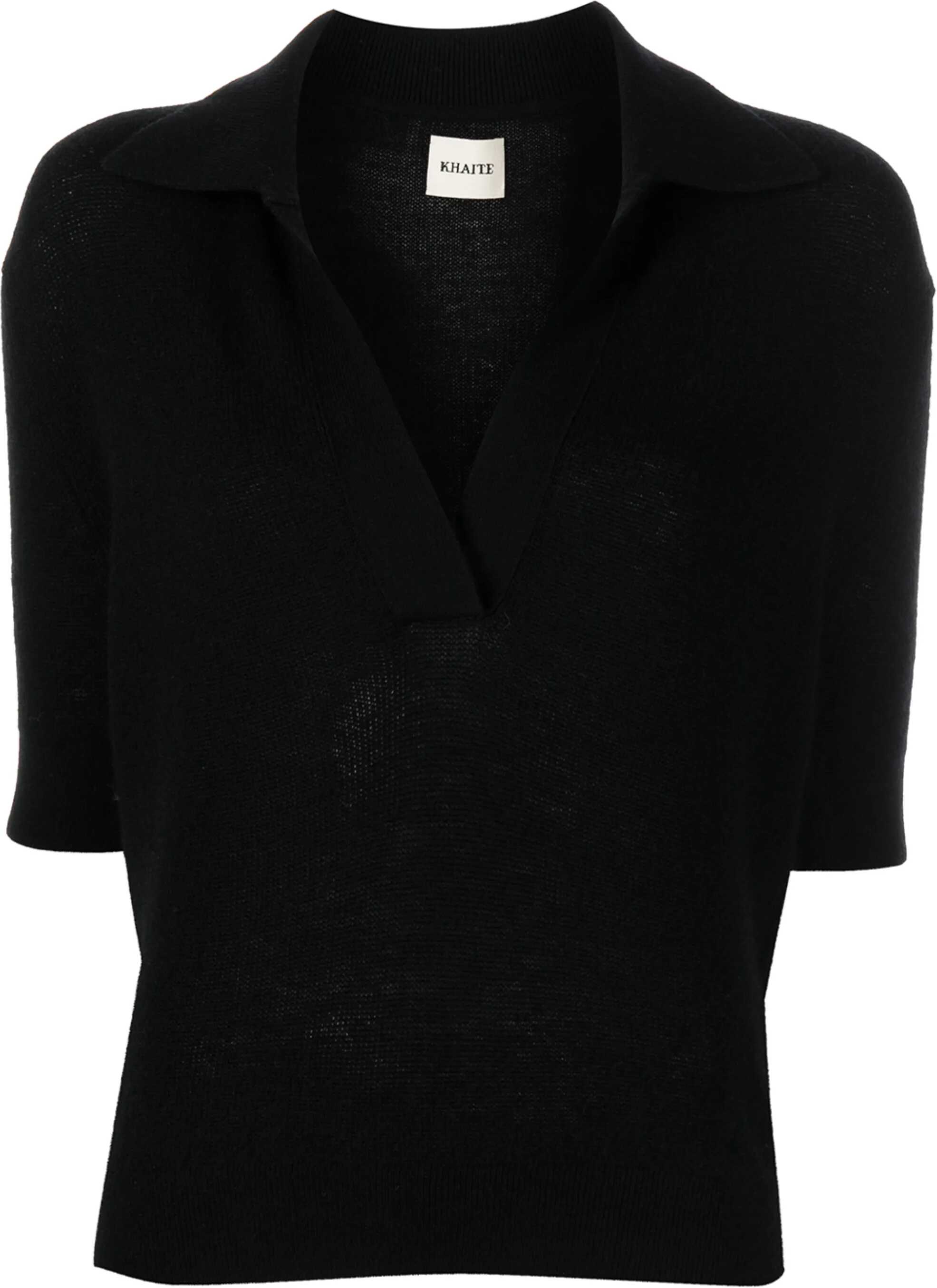 Polo in black cashmere blend. Features an open neckline, compact collar, elbow-length sleeves, and ribbed finishes at the neckline, cuffs, and hem. Relaxed fit.