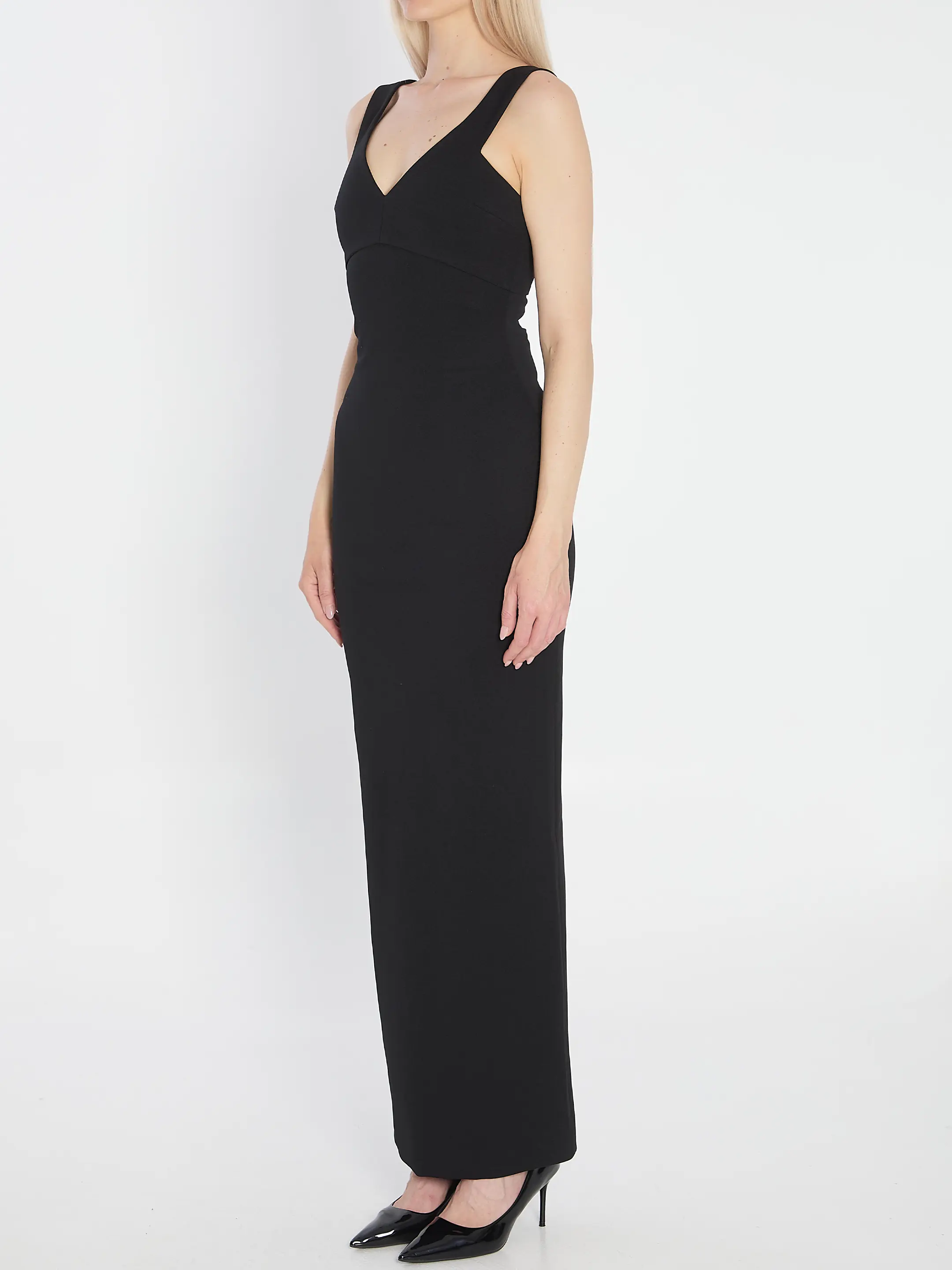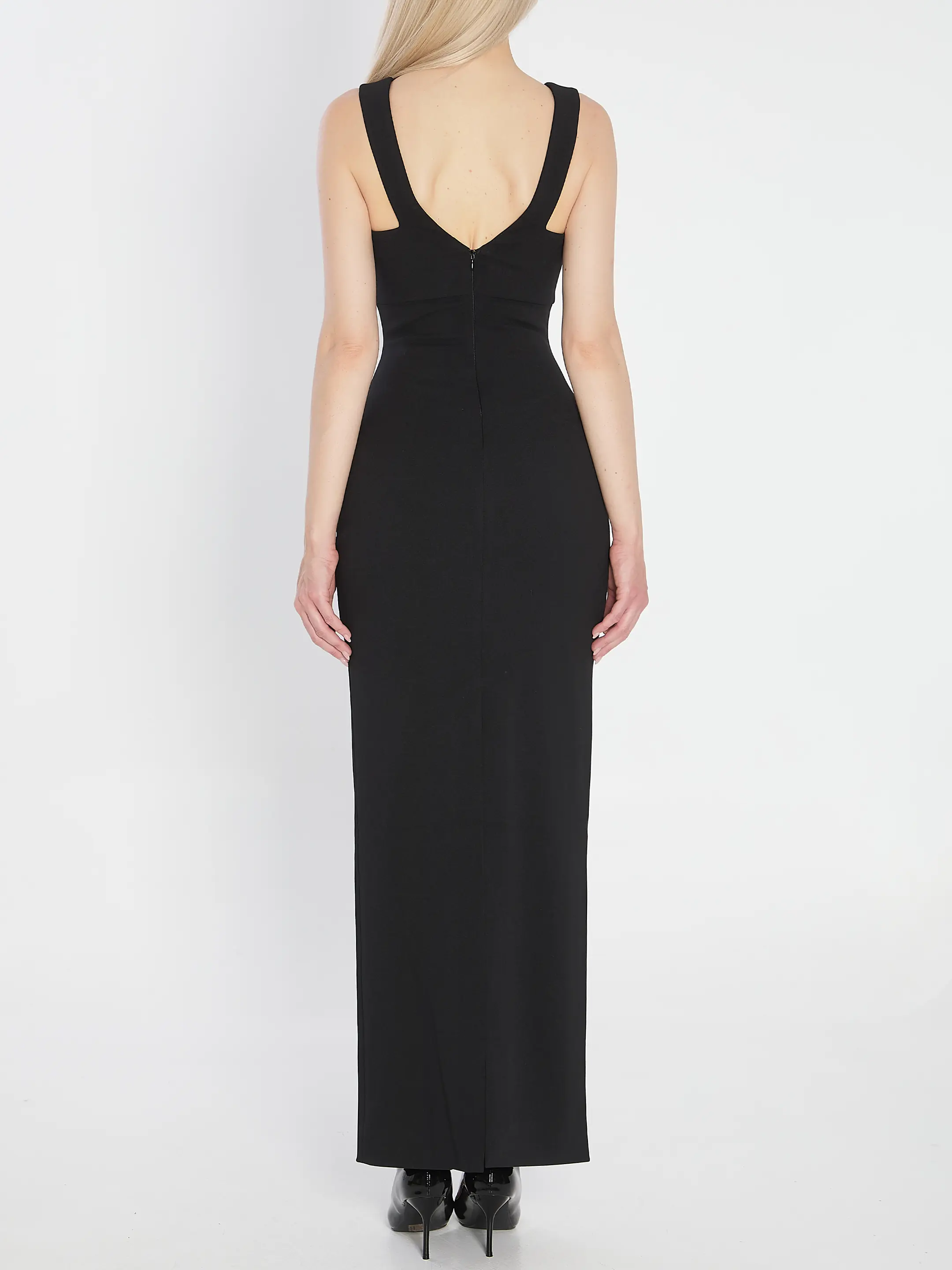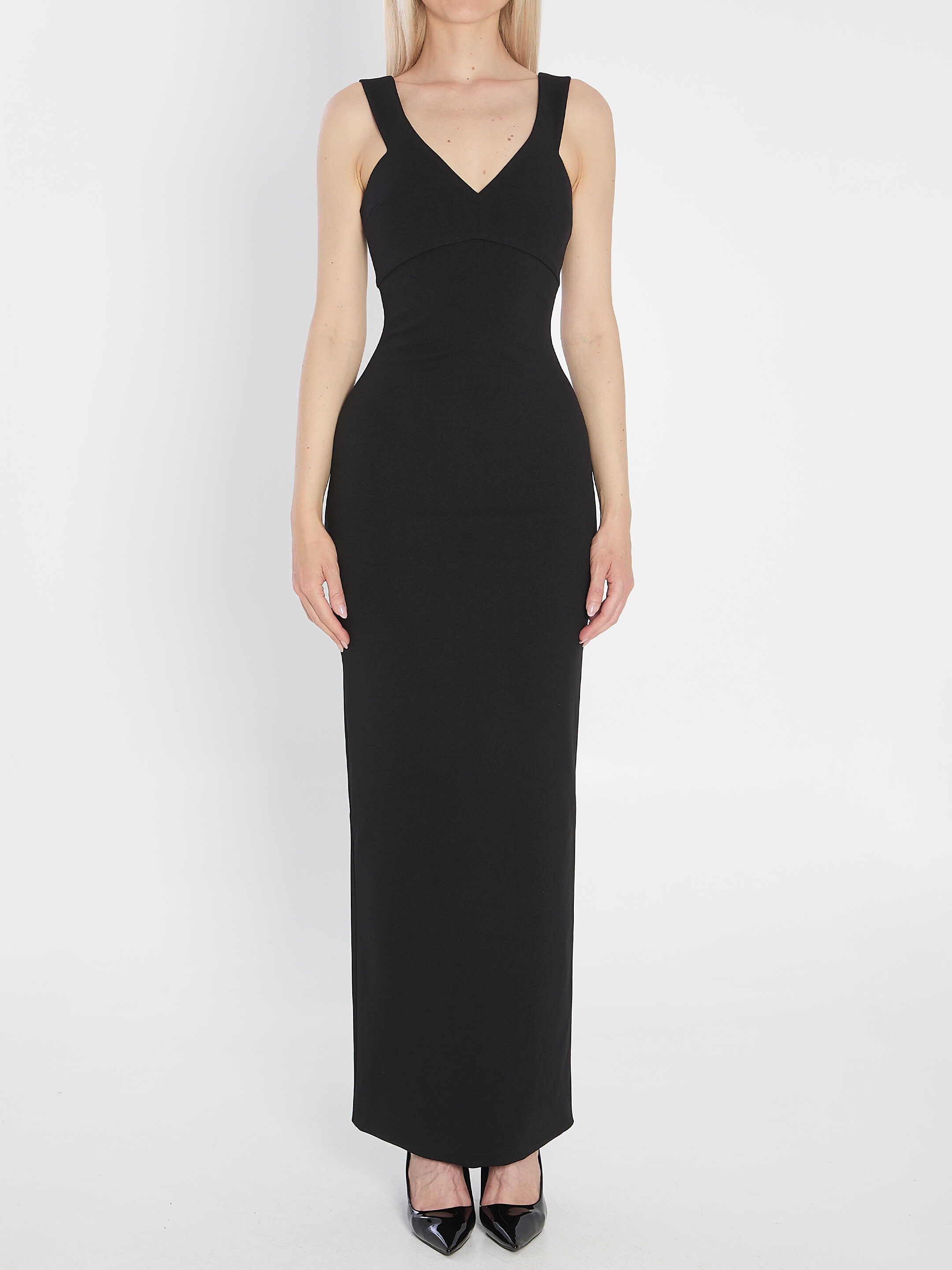 Black maxi dress in polyester. It features a fitted silhouette, V-neckline, off-the-shoulder design with wide straps, semi-open back, central back slit, and a concealed back zip closure.