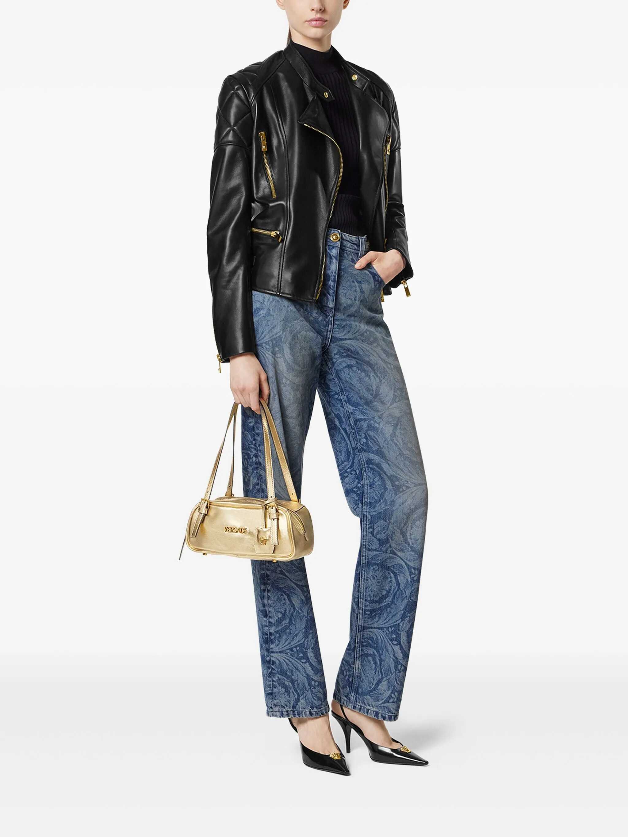 Gold leather shoulder bag. Inside pocket. Two adjustable straps with buckle. Top zipper closure. Width:27Height:11Depth:13