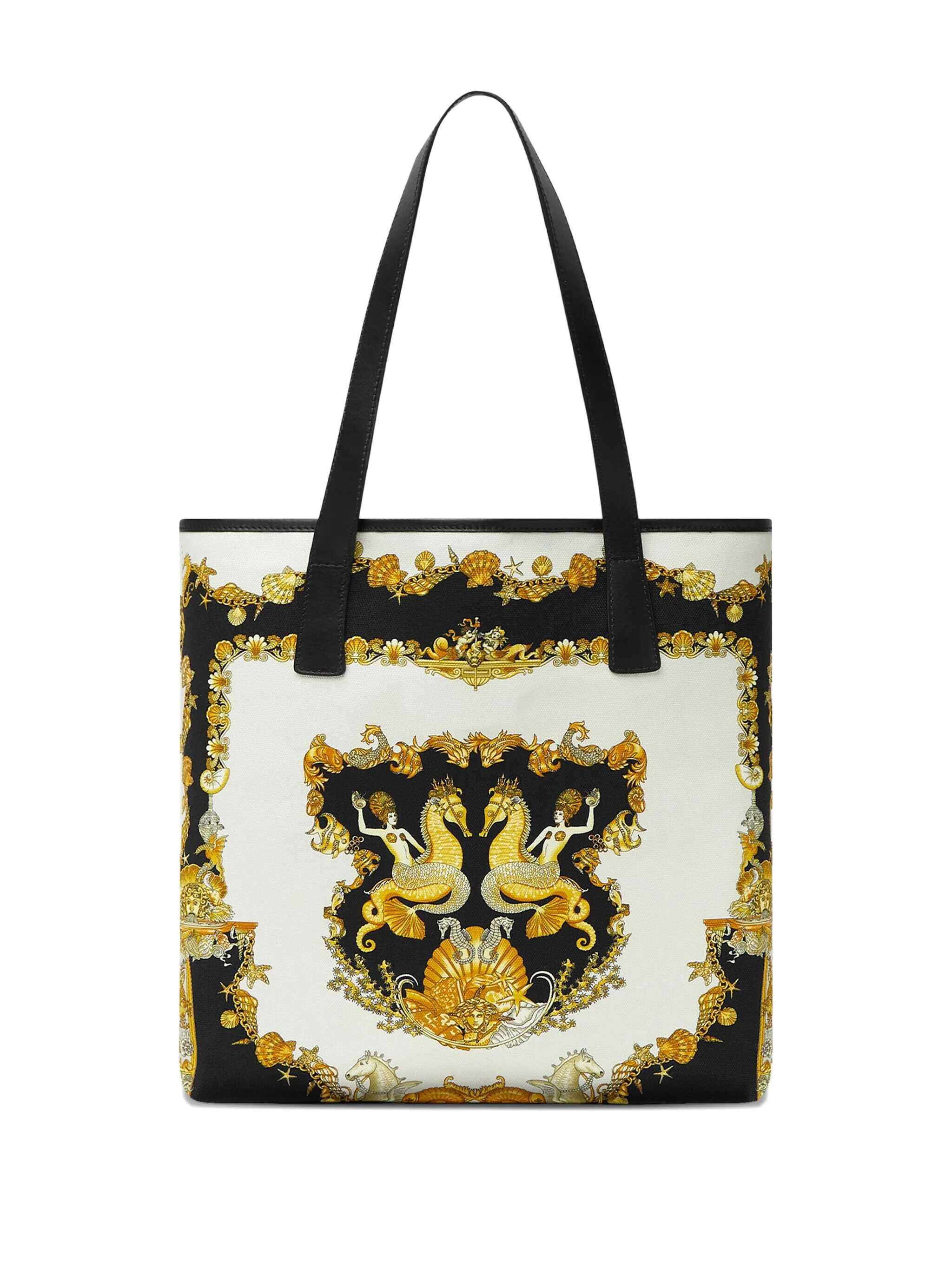 Canvas shopper with Coral Theatre print. La Medusa accessory on front. Two leather handles. Open top. Width:36Height:38Depth:5