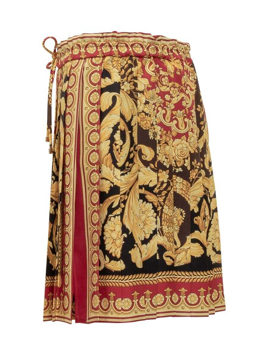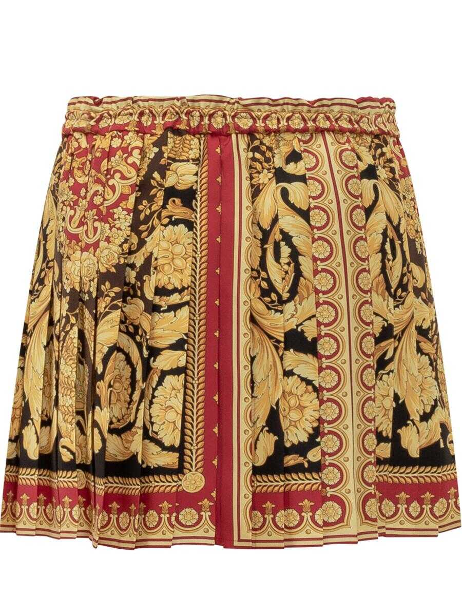 Versace pleated short skirt with elastic waistband and baroque print in gold, red and black tones.