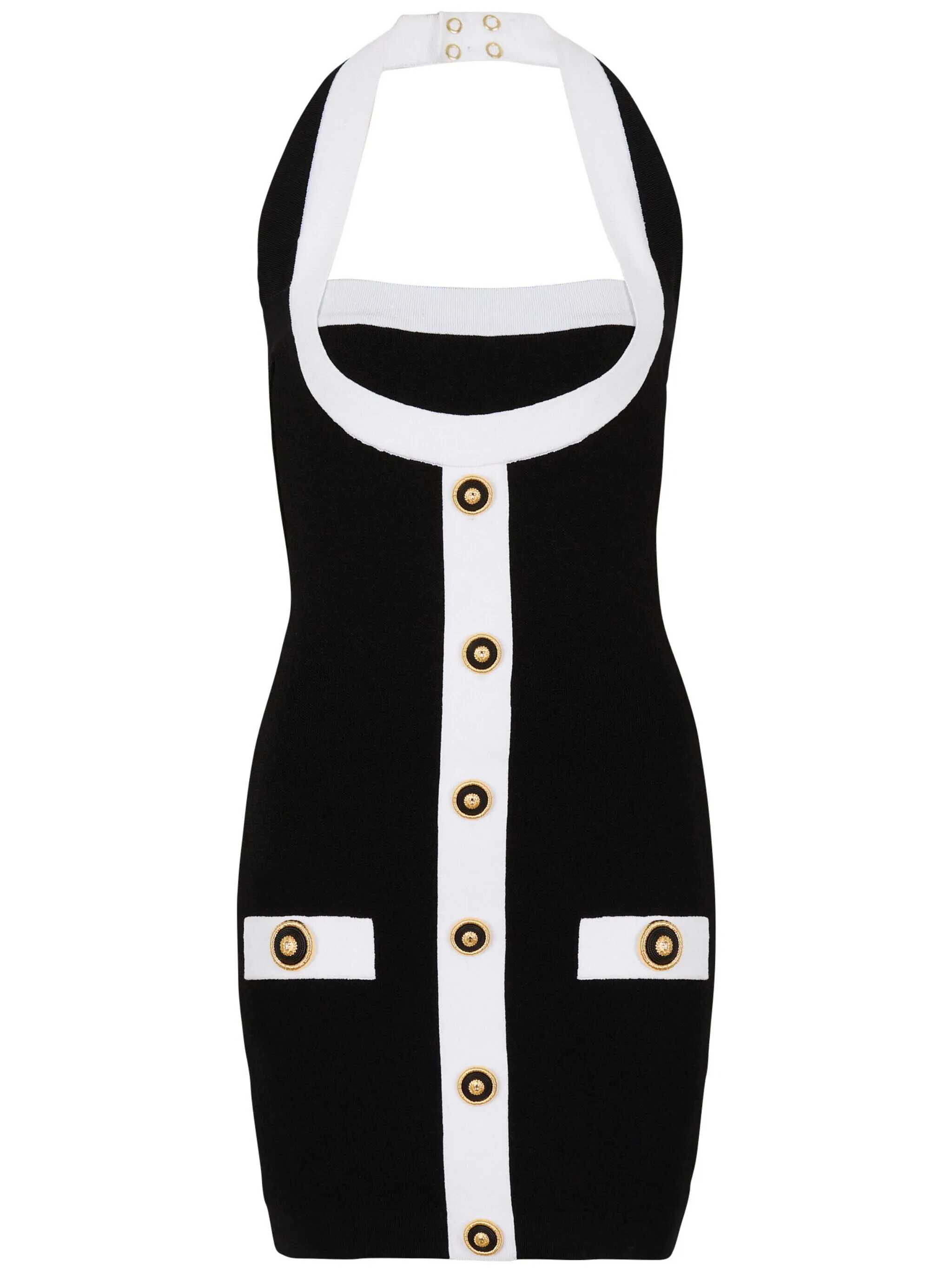 Dress in stretch viscose blend with trompe l'oeil details and 'Filo Leone Catena' buttons, bare back, back zip closure, sleeveless, neck strap with snap button closure