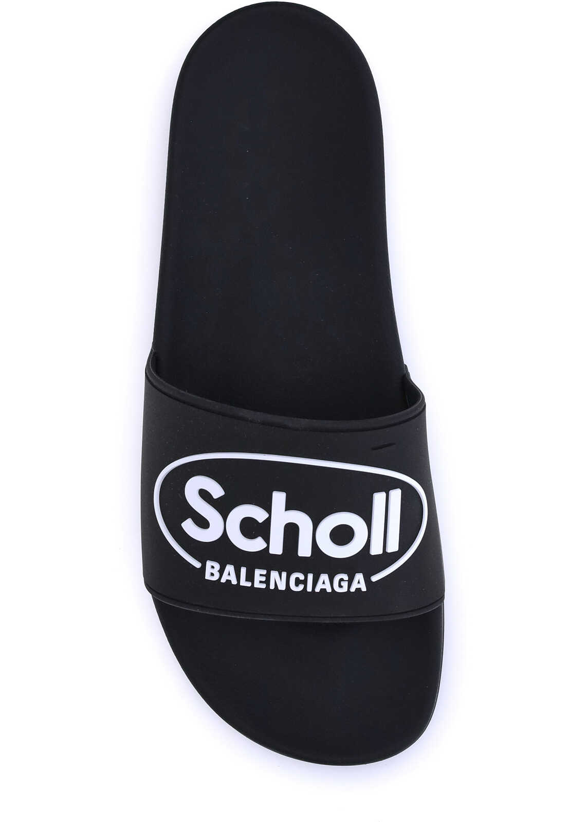 The Sholl X Balenciaga Rubber Slippers feature a flat sole and the iconic contrasting logo on the front band, combining comfort and distinctive design in a casual, contemporary style.