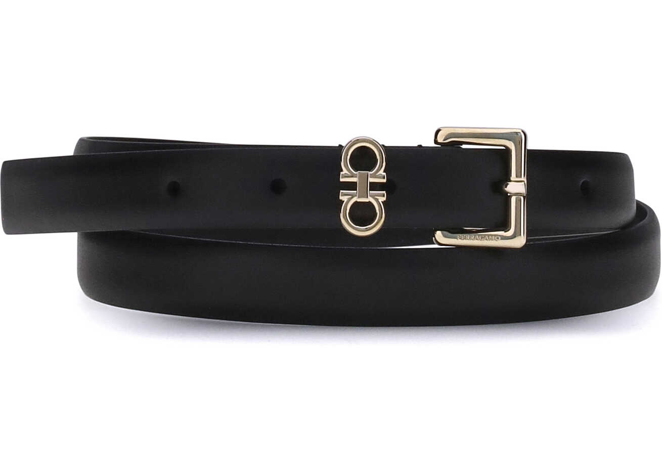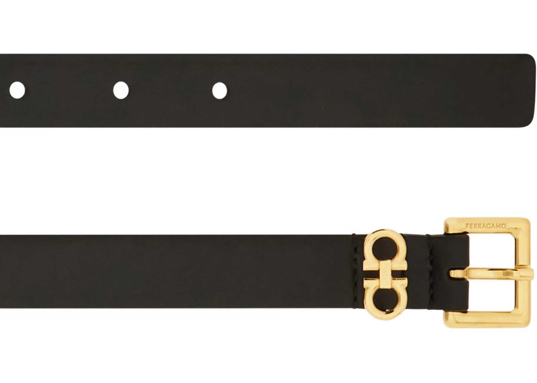 Ferragamo's Gancini Belt is made of soft calfskin with a natural graininess, with a slim shaft for refined femininity. The geometric buckle in a gold finish is embellished with a double Gancini loop, the brand's iconic symbol. An elegant accessory that combines design and quality.