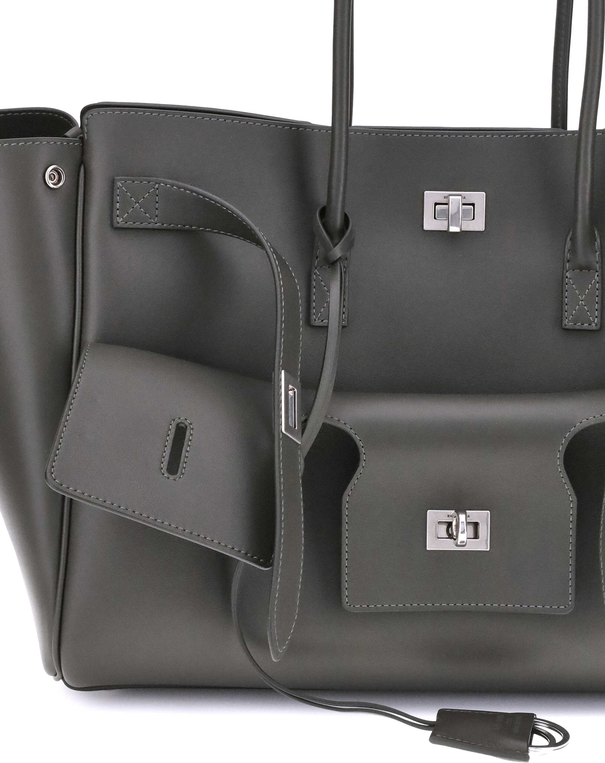 Balenciaga's Bel Air medium Shoulder Bag is a spacious and functional accessory with a versatile pouch design. It features two handles for convenient carrying and the Balenciaga Paris logo embossed with silver lamination on the back, attesting to its authenticity. Enhanced with silver hardware and a removable key ring with double spiral loop, this bag is designed for organization: it includes snap buttons on the sides to modulate the shape, a swivel closure, and belts on the front with engraved logo. The interior features a large front pocket, an open main compartment, two interior zippered pockets and two interior flat pockets, offering practical solutions for every need.