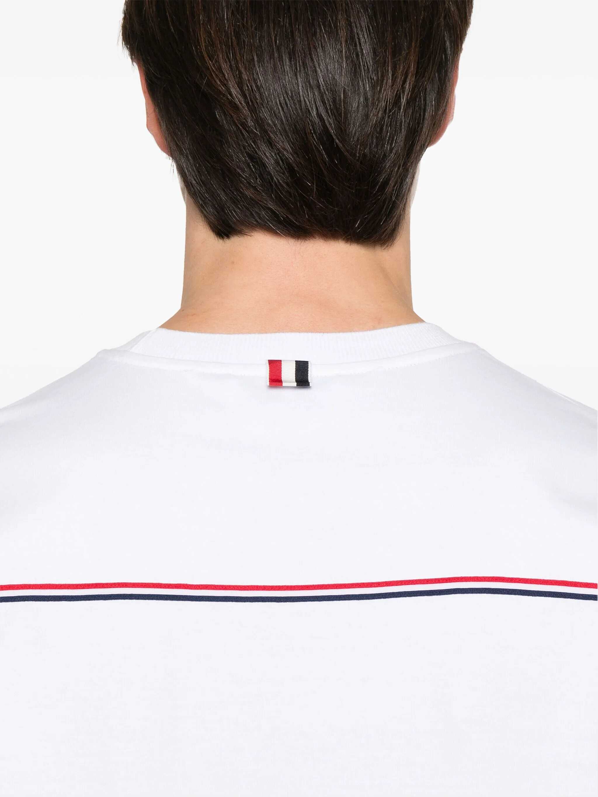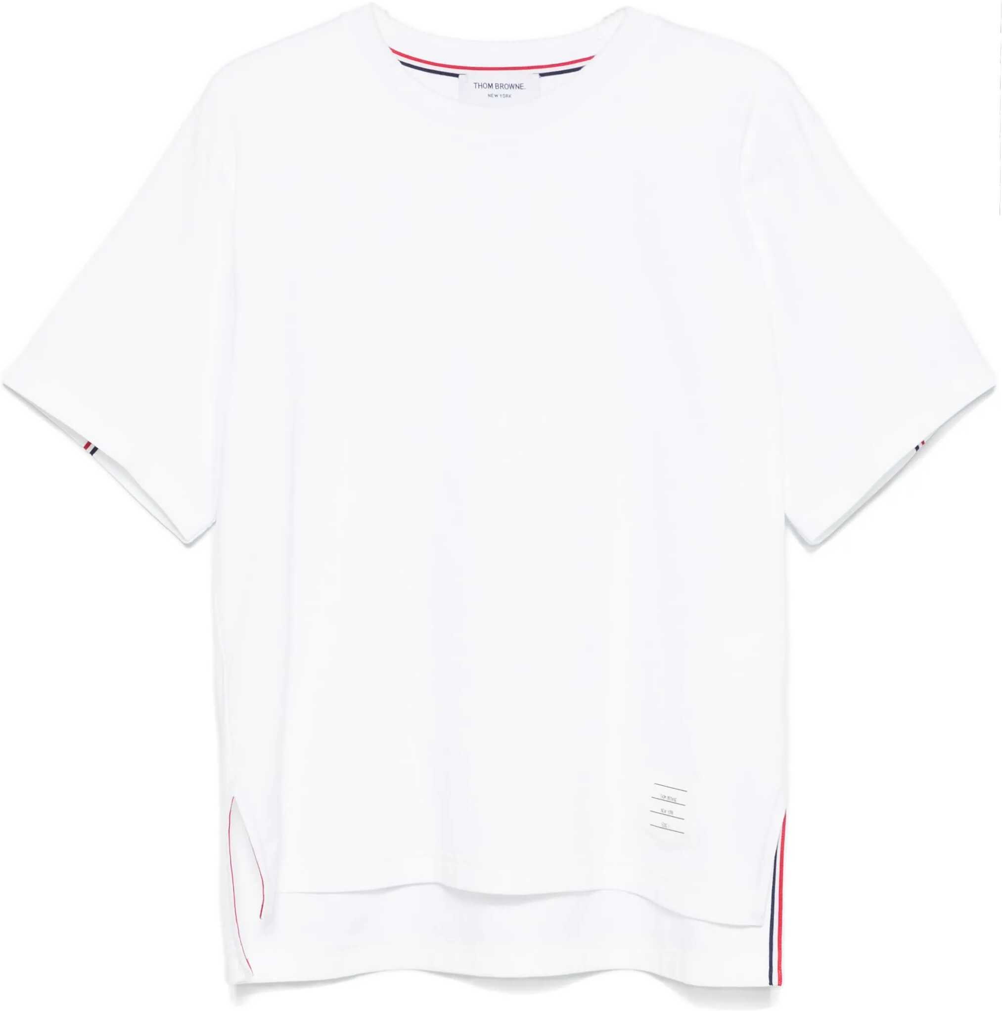 Thom Browne's oversized T-Shirt combines an essential aesthetic with distinctive details. Made with a ribbed crew neck, it features two side slits that add comfort and movement. An iconic patch stands out on the front, while colorful bands on the back lend an unmistakable touch, discreetly signing off the brand's style.