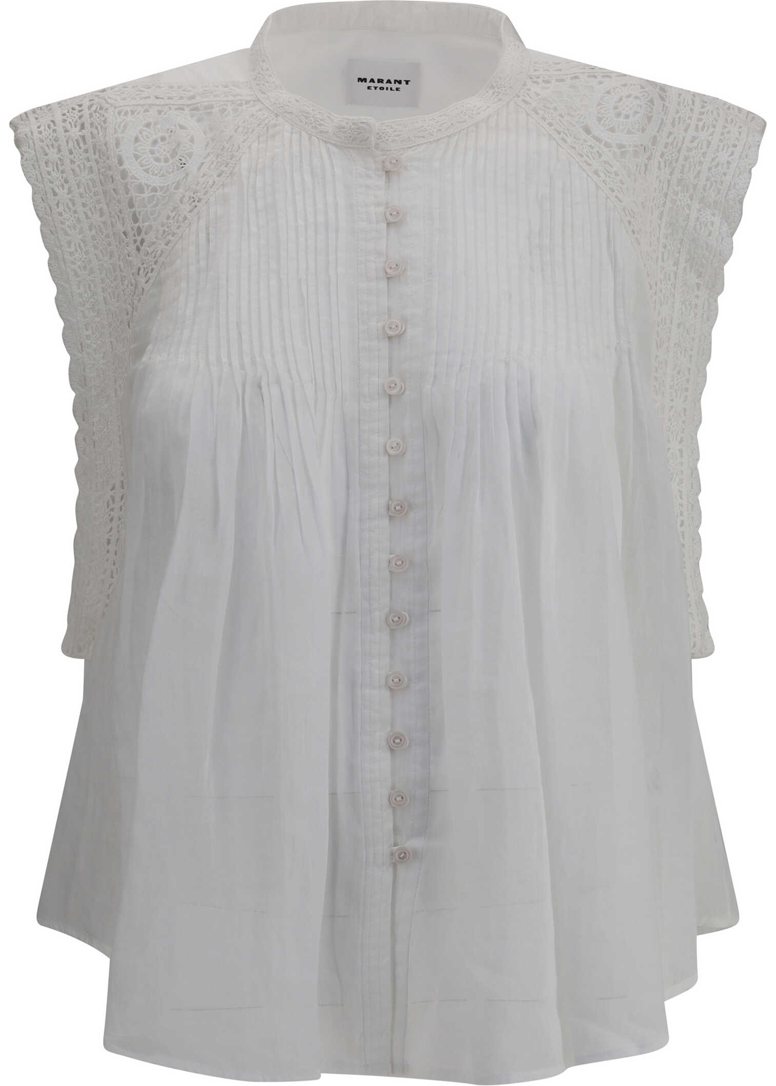 Marant Étoile's Gresia Top is a delicate and refined garment, perfect for an ethereal and sophisticated look. Made of lightweight cotton voile and lace, it offers an impalpable and romantic texture. It features a round neckline embellished with embroidered lace, which adds a handcrafted and precious touch. Perforated lace inserts at the shoulders lend an additional note of femininity and lightness to the sleeveless design. With a practical front button closure, a rounded hem, and a straight cut, this top embodies the casual elegance typical of Marant Étoile.