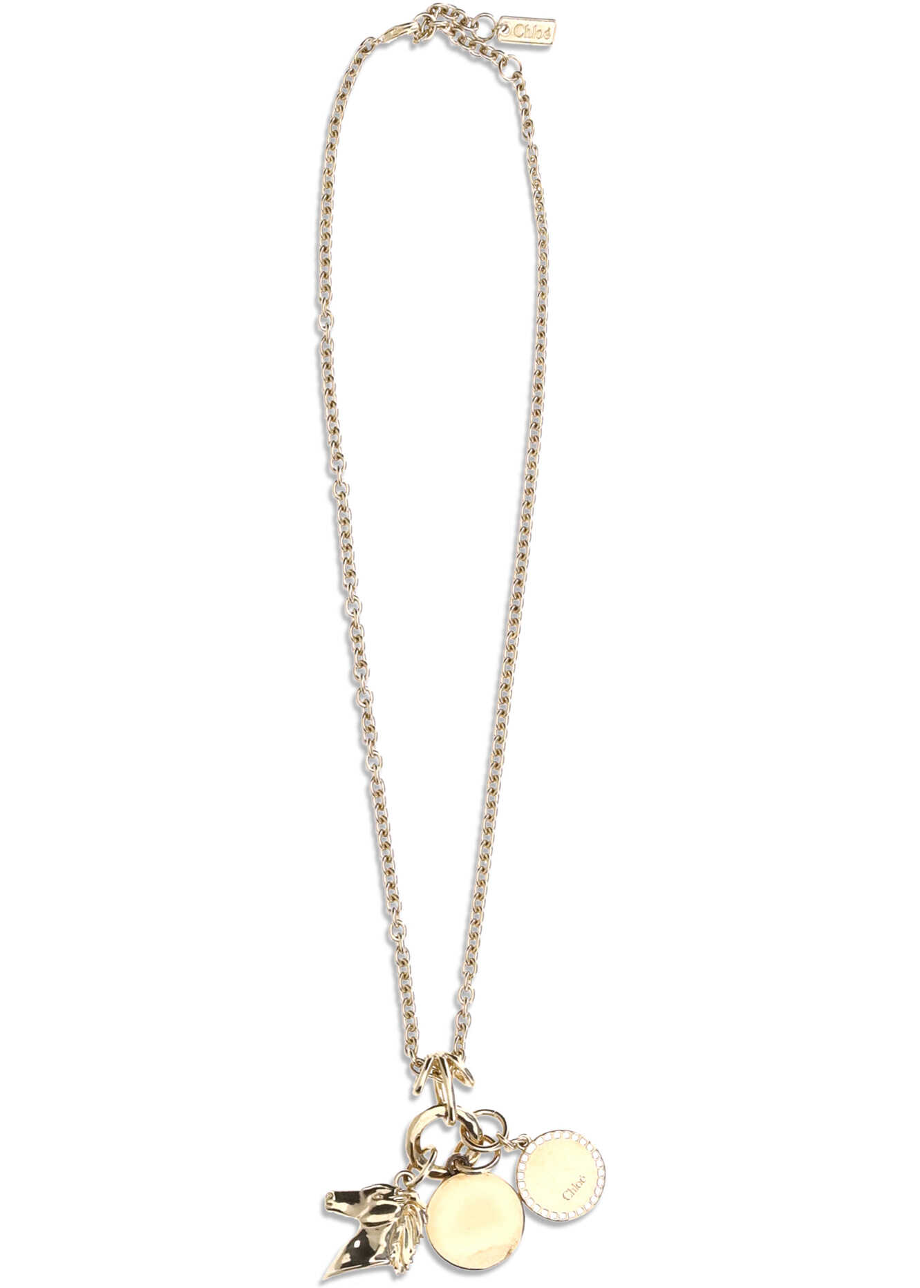 Chloé Necklace with a refined design and classic lobster clasp closure. The model is embellished with a horse head pendant and two additional pendants with an embossed finish. An elegant and symbolic accessory, perfect to enrich the look with a distinctive touch.