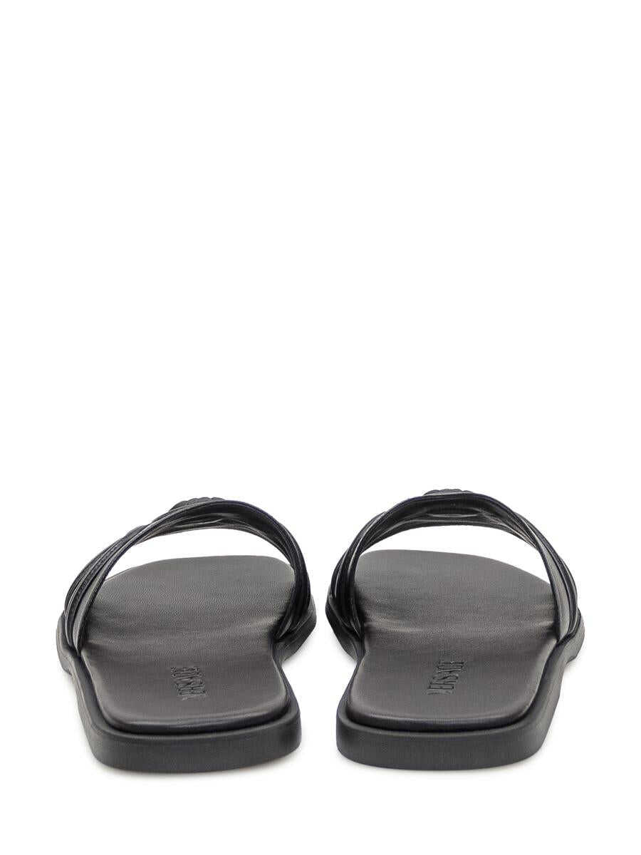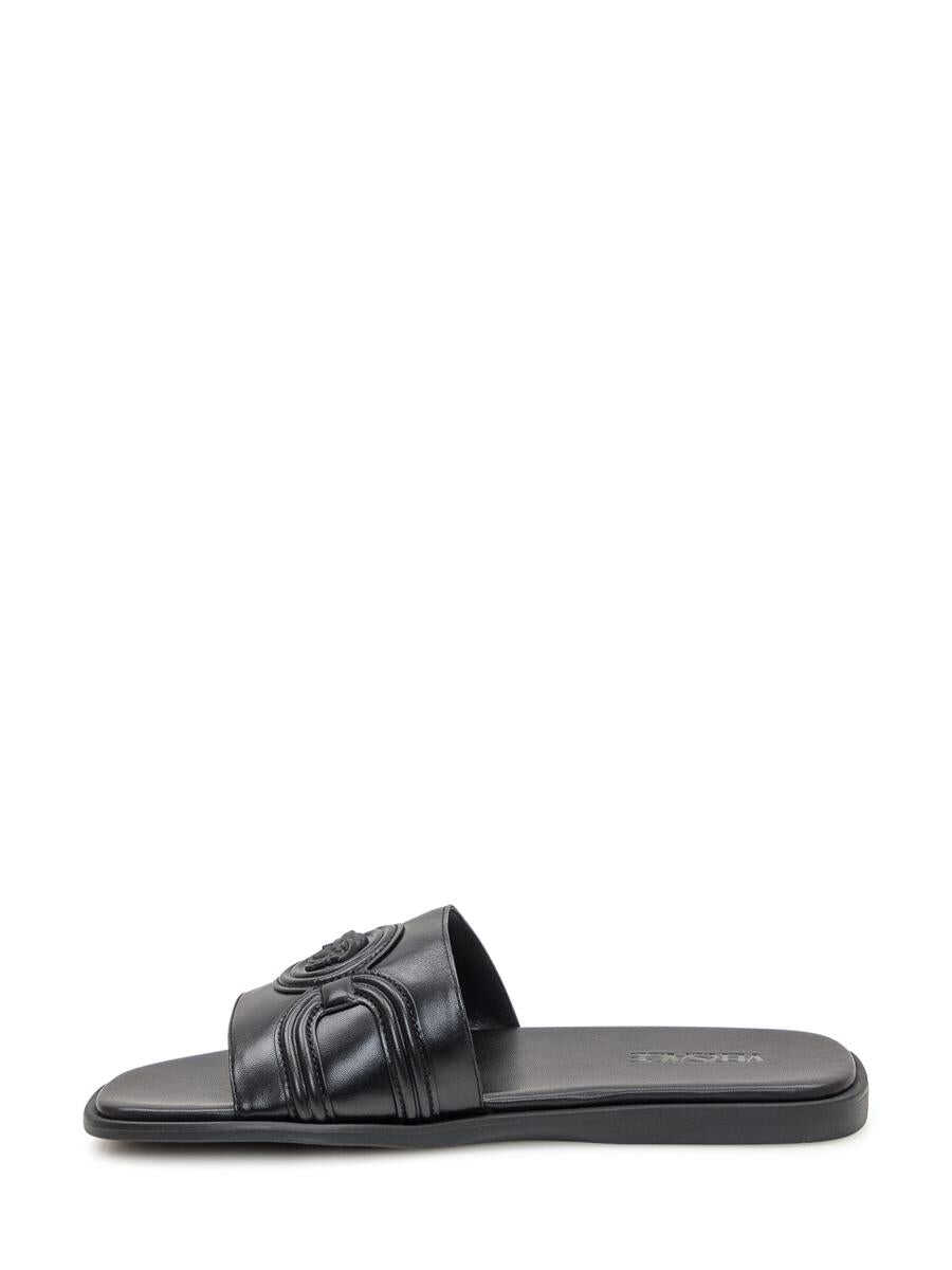 Versace slipper made of soft black leather with a contoured footbed and squared toe. The design is embellished with the iconic tone-on-tone Medusa applied on the central strap and the logo embossed on the insole.
