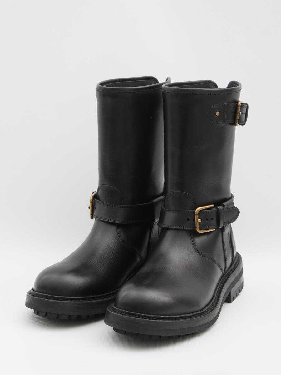 Black smooth leather boot. Features buckle straps and snap buttons, back zip closure, rounded toe.