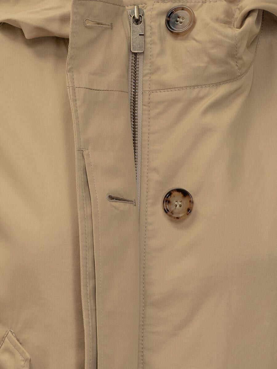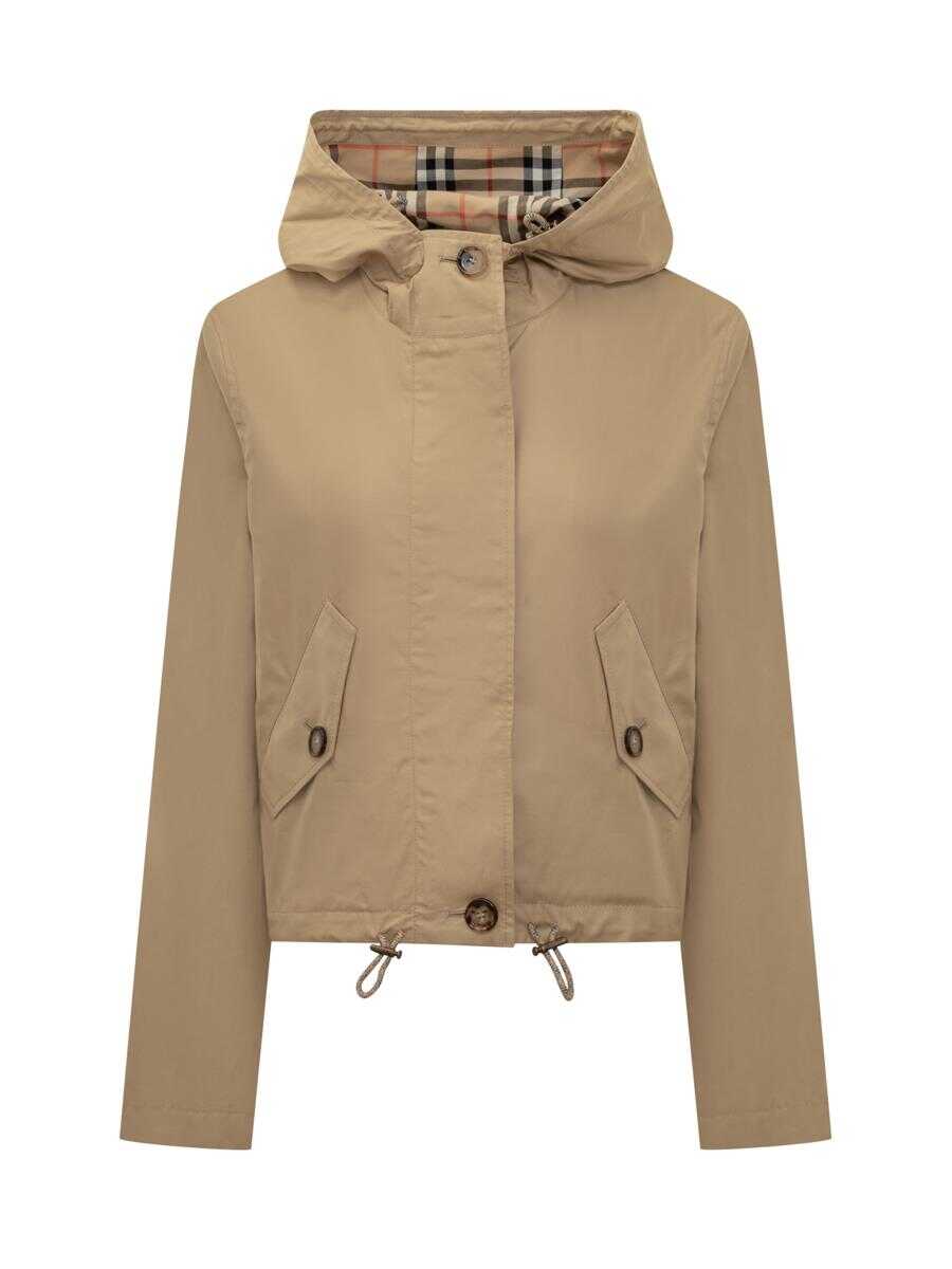 Burberry women's short jacket in beige technical fabric with fixed hood and inner lining with iconic check pattern. Zipper and button closure, adjustable drawstring waist.