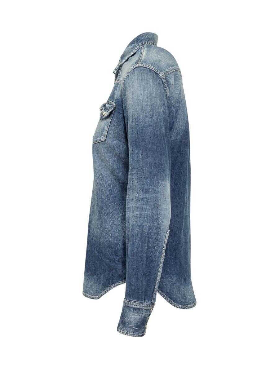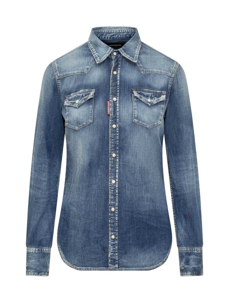Dsquared2 washed-out effect denim shirt with snap buttons, flap pockets and iconic red logo.