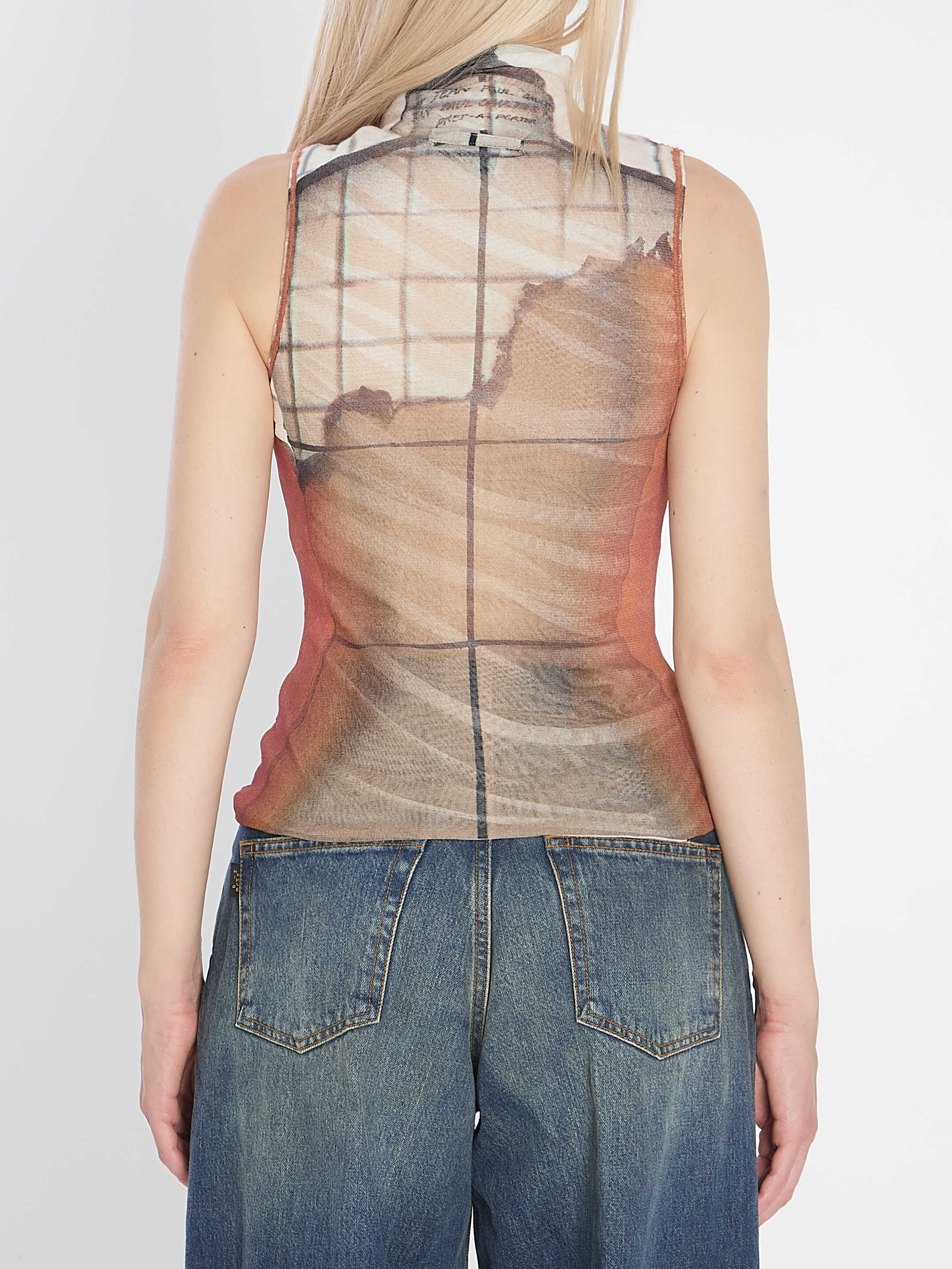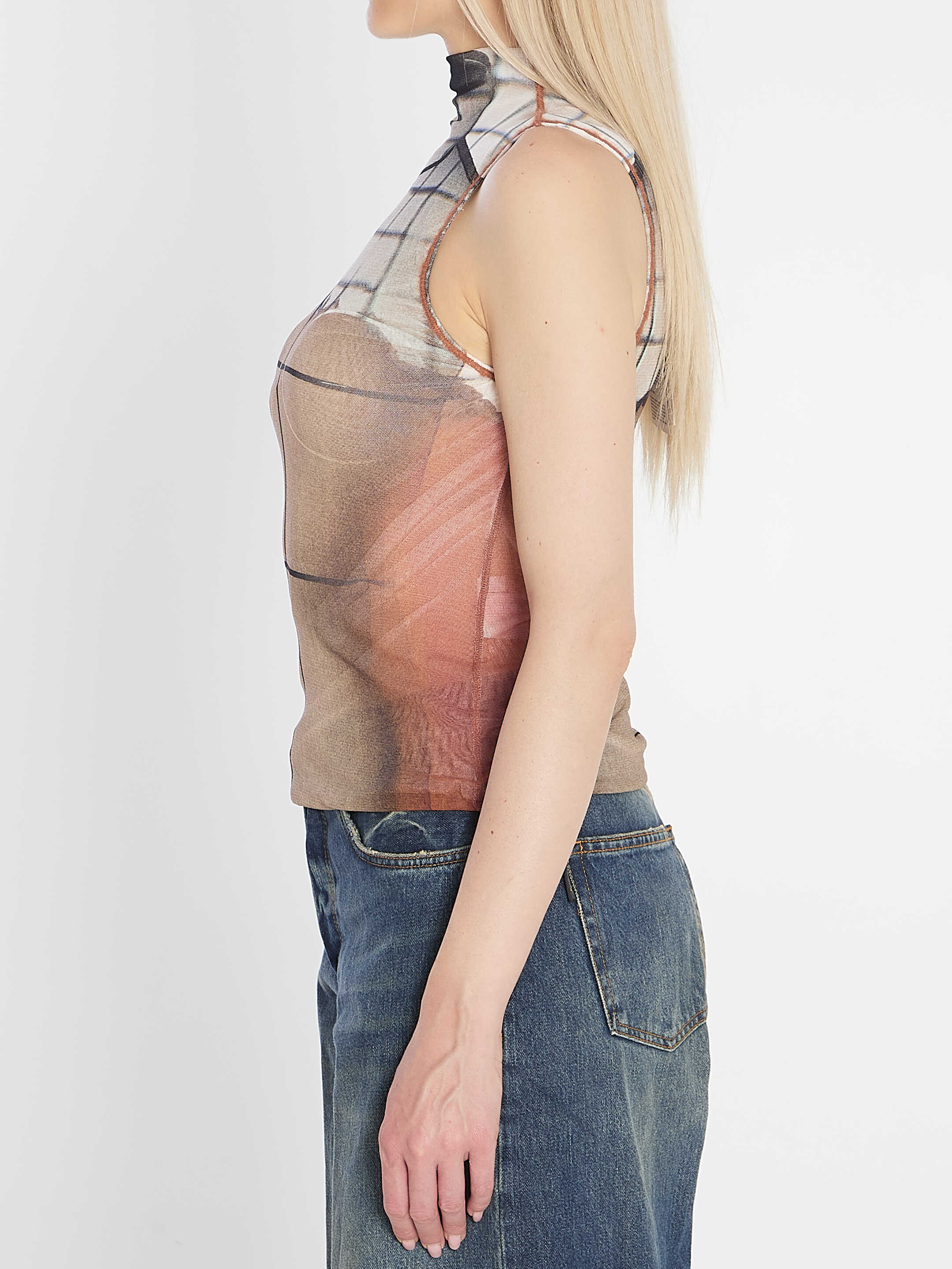 Top with Fire print. Features a soft high neck, tulle lining, mohair details, and stretch fabric. Sleeveless. Slim fit.